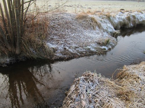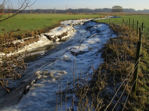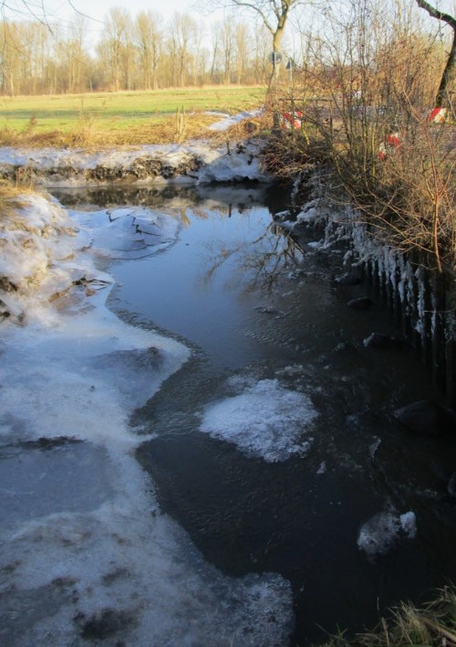 Eine entgegenkommende Radlerin frage ich, ob ich den Elbdeich erreichen werde. Sie kann es nicht beantworten, kam aus einer Nebenstrecke (die, wie ich auf der Rückfahrt sehe, noch mit Schneematsch und Eis fast in voller Breite bedeckt ist).