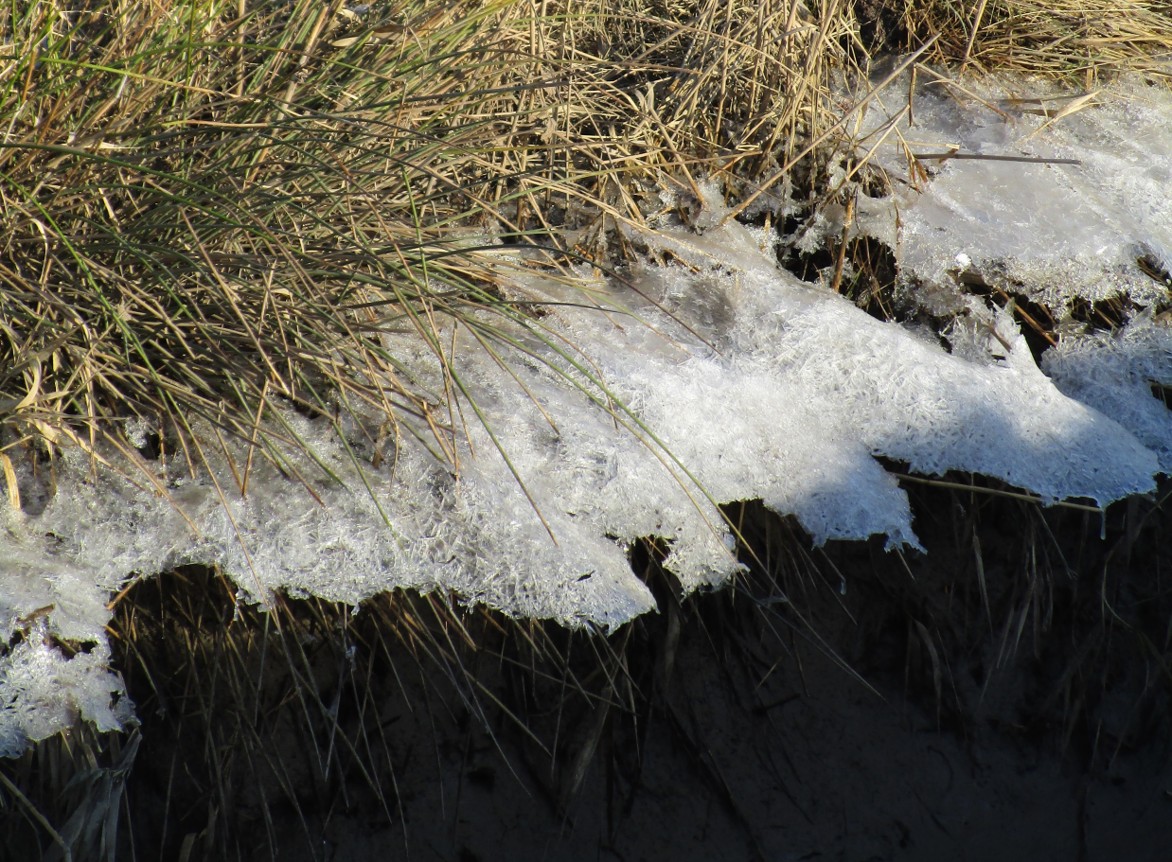 … am Elbe-seitigen Deichhang Schneereste und -reste von Skulpturen.