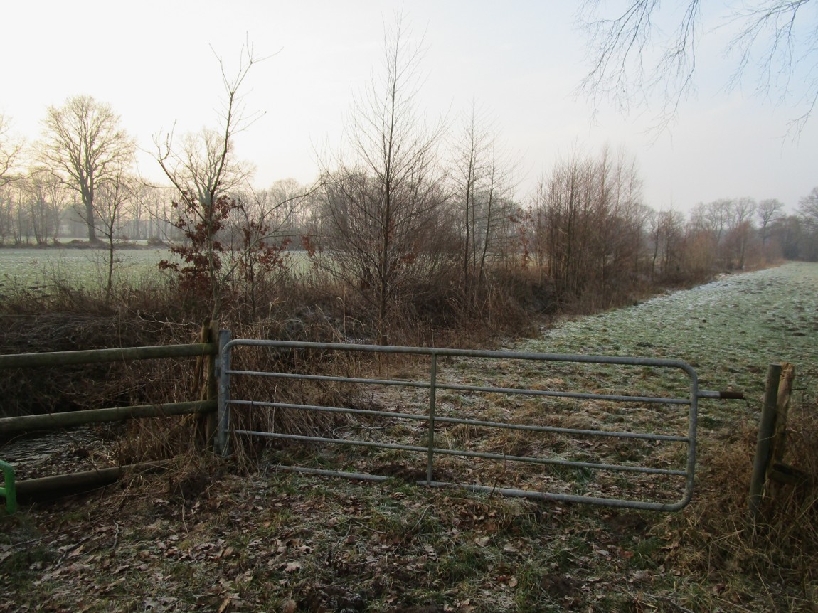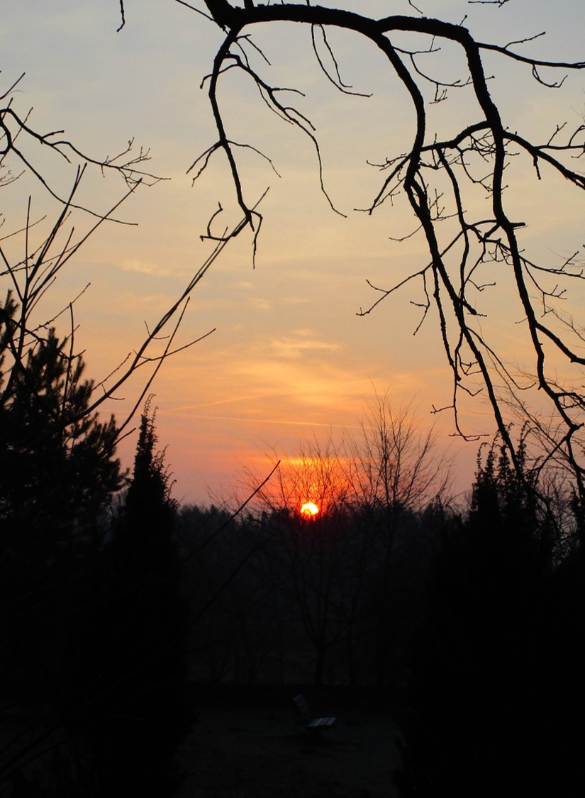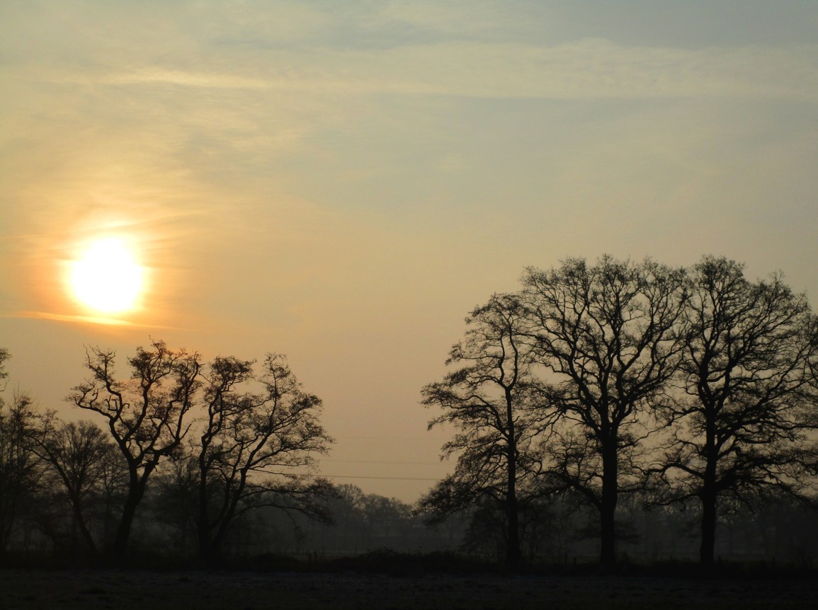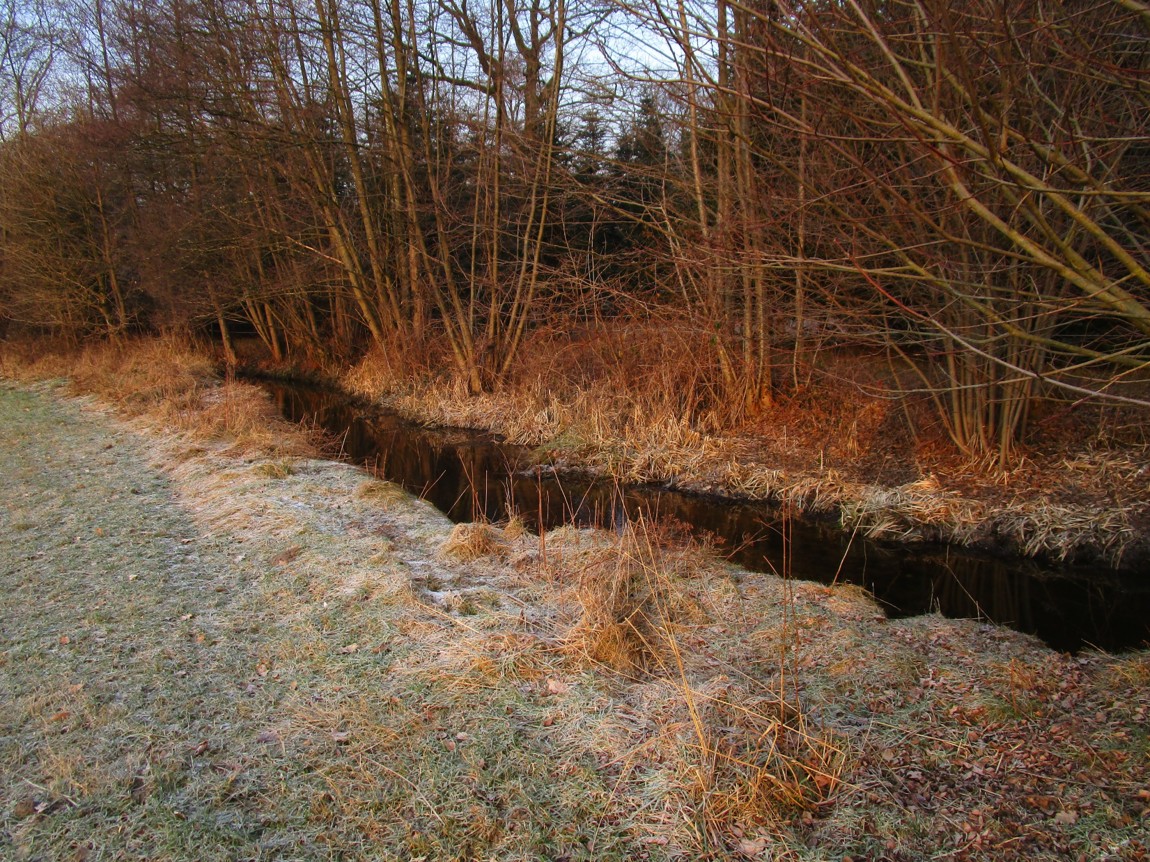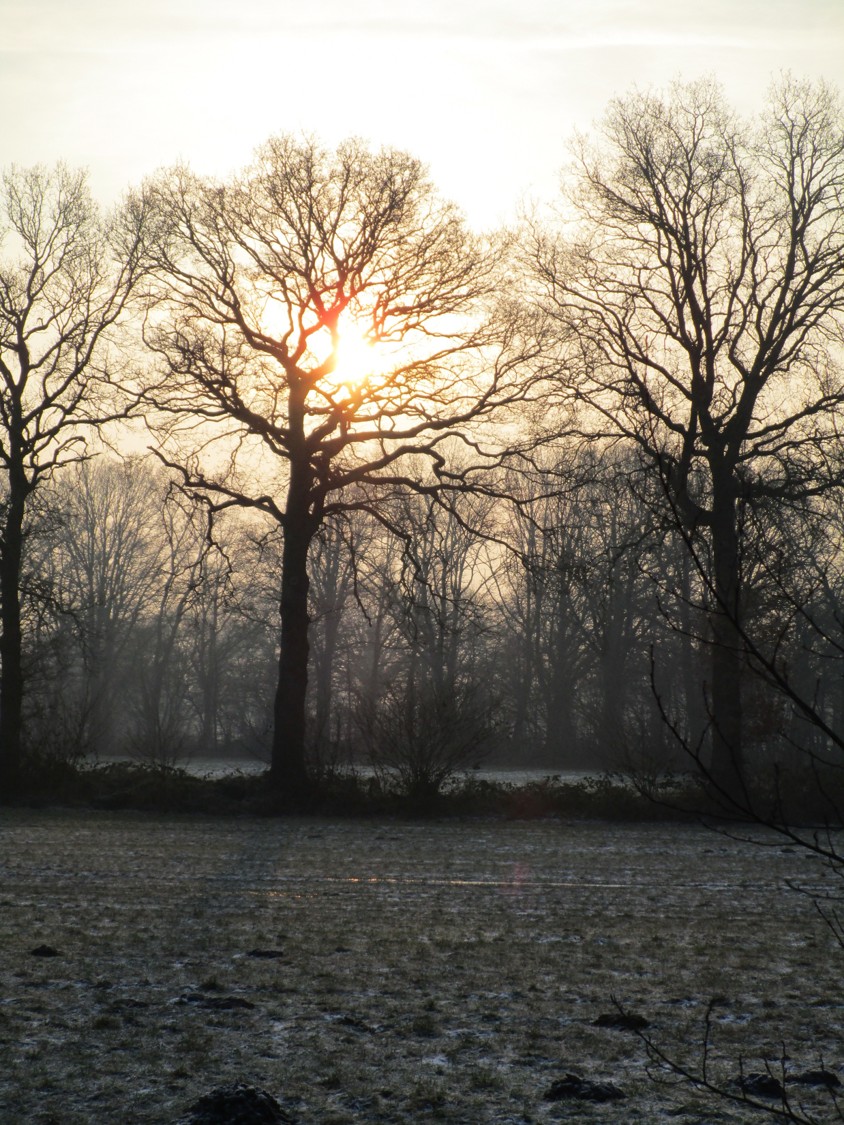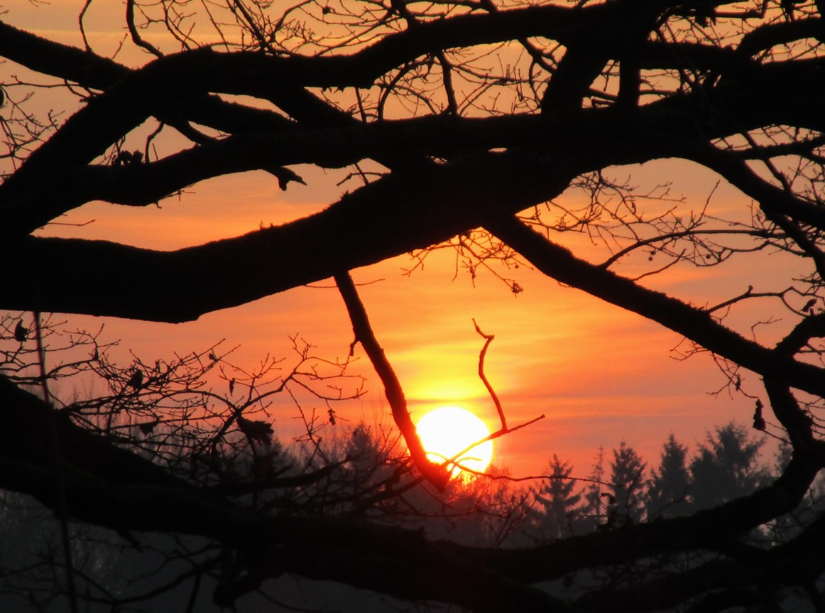 Blick Süd – tiefstehende Sonne jenseits des Brunnenschutzgebiets.