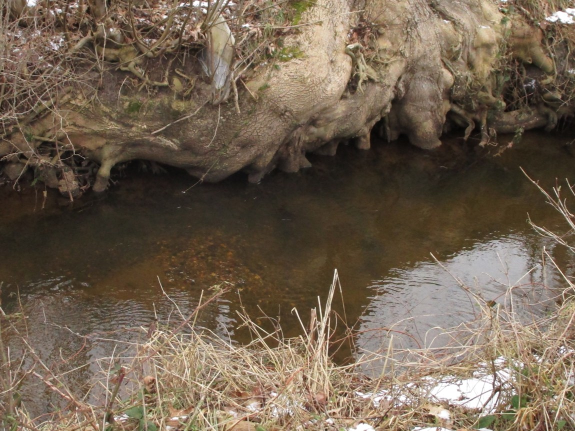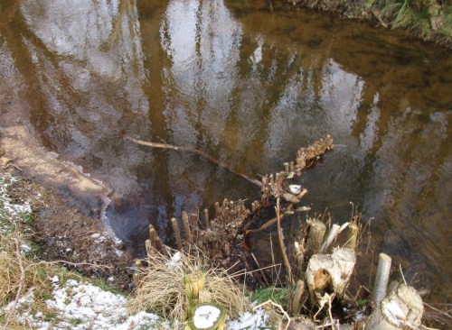 Mit Verbesserungswillen, die Erosion im Prallhang zu verringern, wurde vor vielen Jahren eine Buhne als Strömungslenker gebaut.