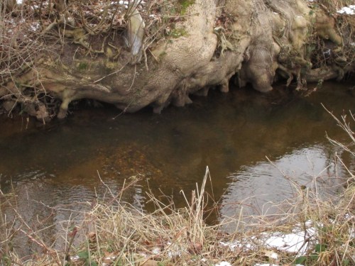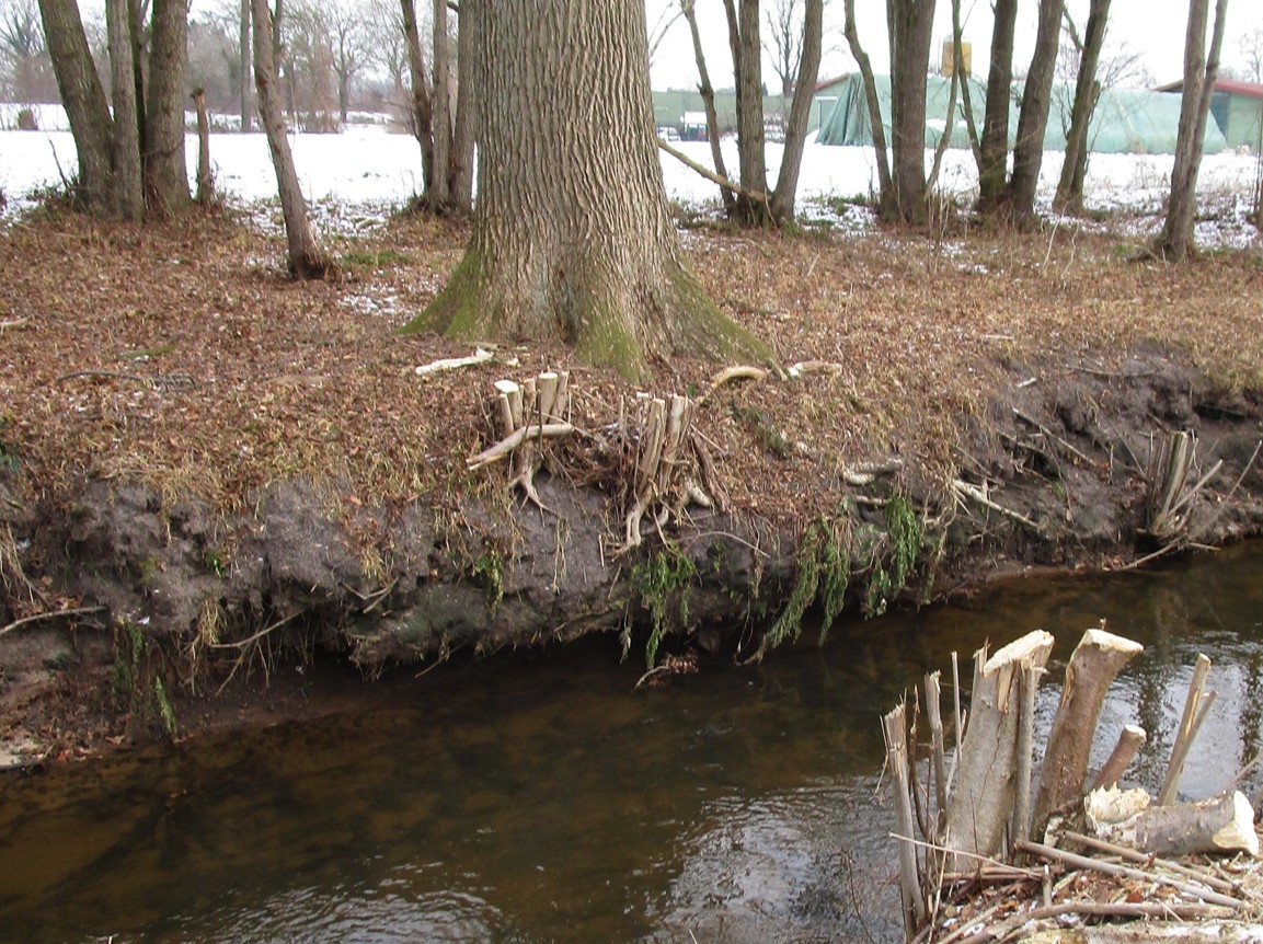 („Riprap“ verstehe ich hier als Wirkung, nicht im Sinne des Erfinders als konservative Anwendung von Steinbruch oder ähnlichem. Gar grässliche Versteinerungen ganzer Gewässerstrecken sind vielerorts so entstanden. – Es gilt, einen standortgerechten Uferschutz mit Lebensraumwirkung zu finden, unter Einbeziehen des Wurzelwerks tief ins Wasser wurzelnder Bäume. In der Regel trifft das in unseren Breiten nur auf die Schwarzerle zu.)