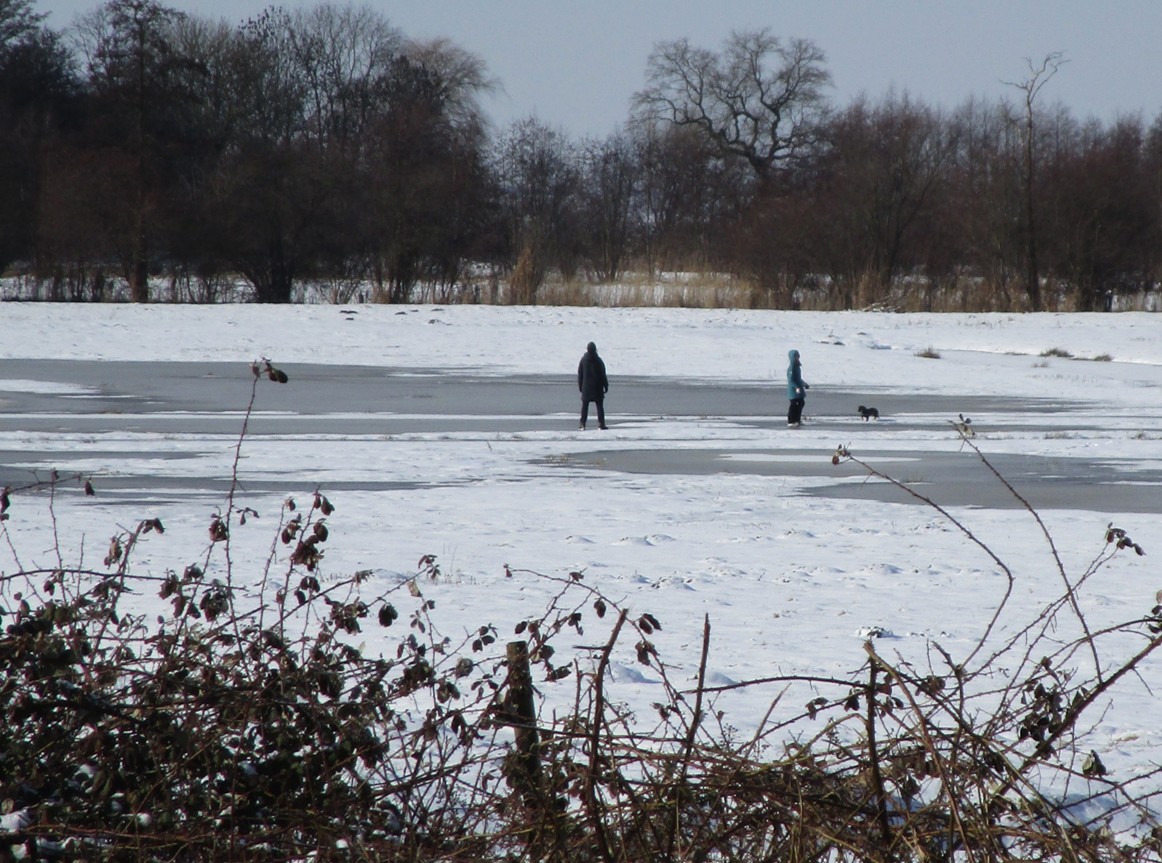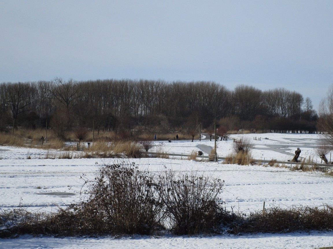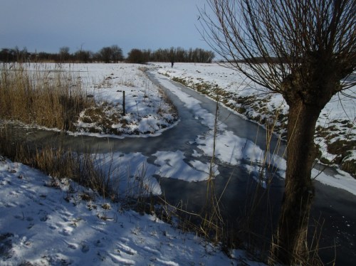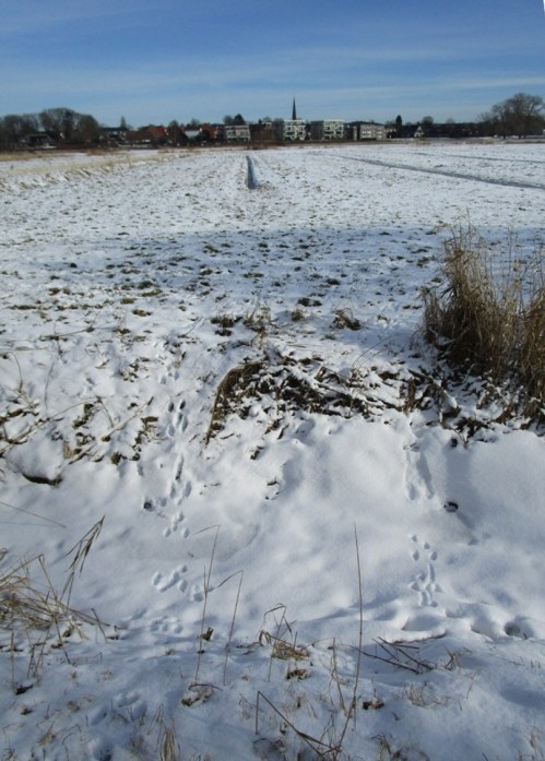 Fahrradschlüssel gegriffen – und los. – Die Marsch vor dem Geesthang, wieder flächig weiss. Kein Land für Graser!