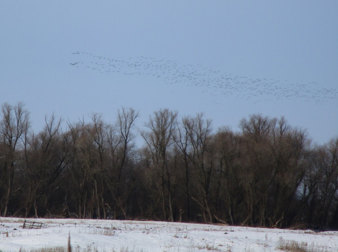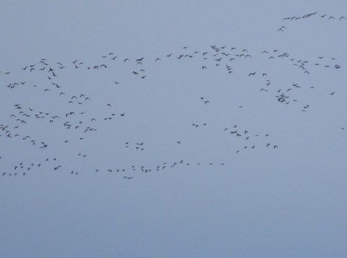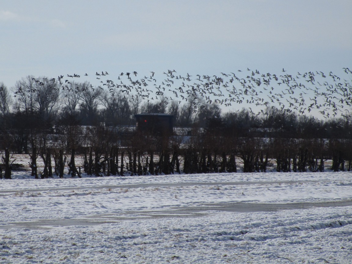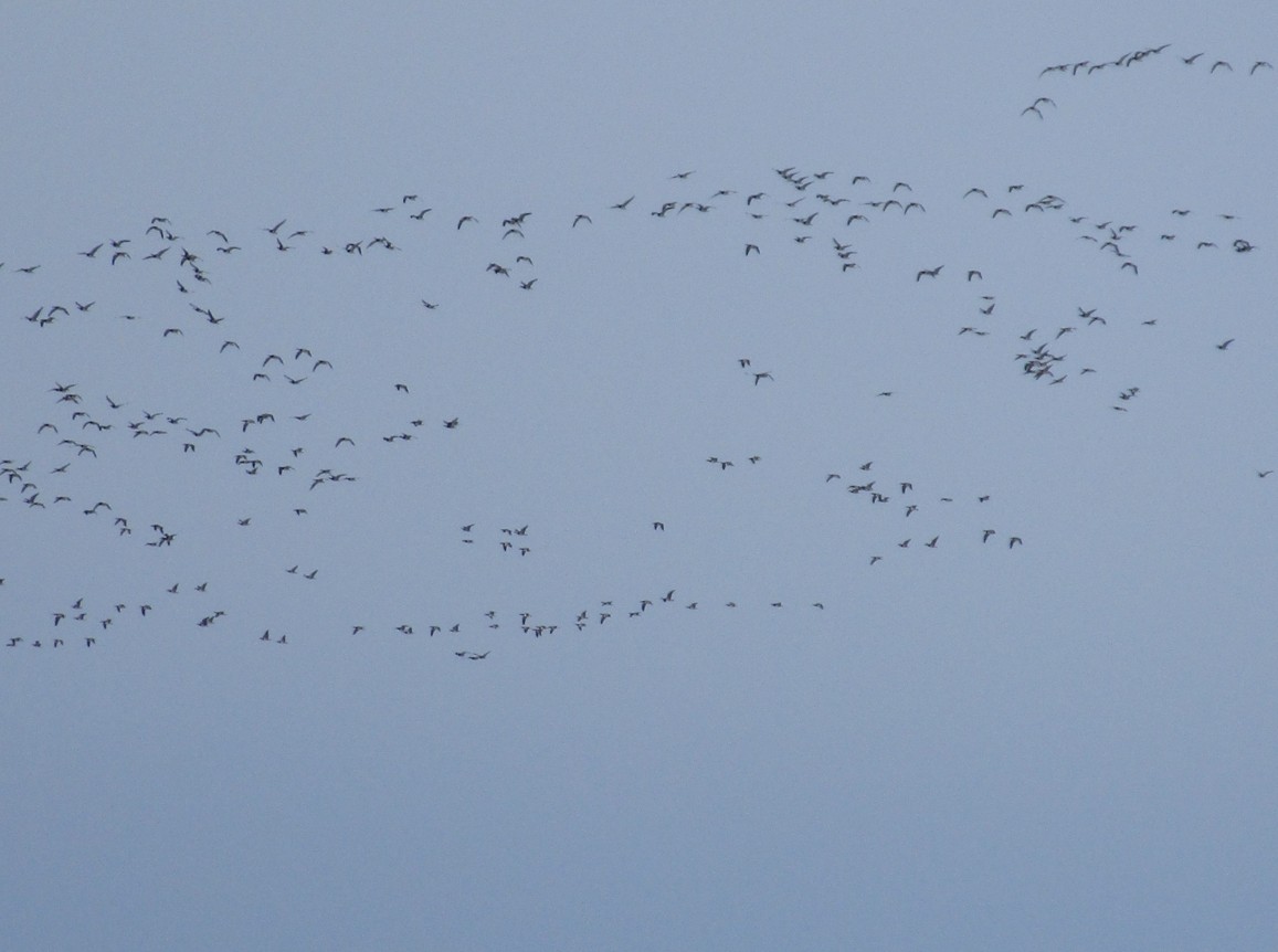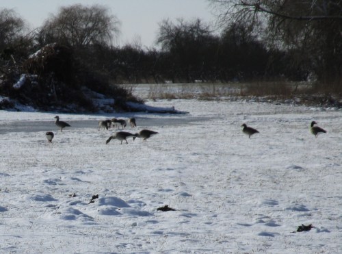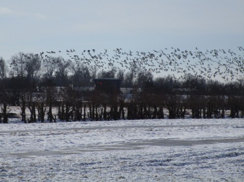 Heute Morgen vorm Elbhang, viele Wiesenflächen sind schnee- und eisfrei – ca. 2000 Nonnengänse sind aufgebracht.