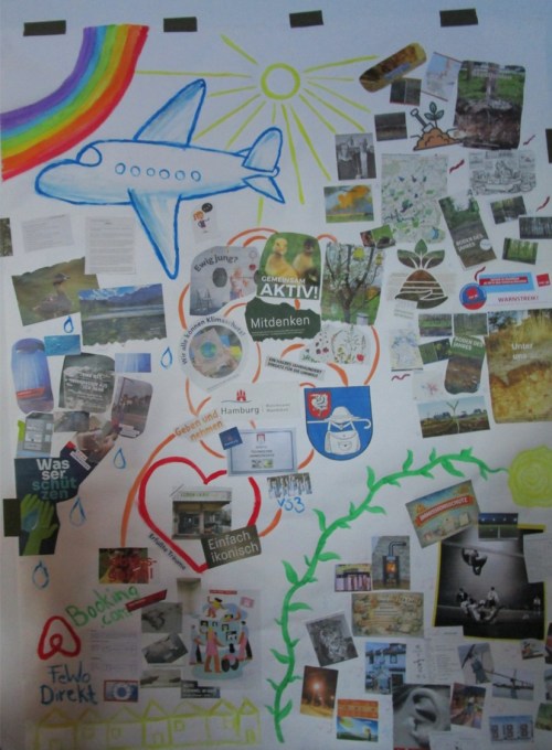 Eine Menge Aufstellspiele hält uns angesichts der Vielzahl Themenstellungen in Bewegung. – Alle bestaunen diese bunte Wand.