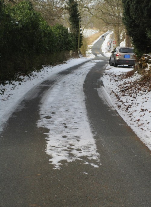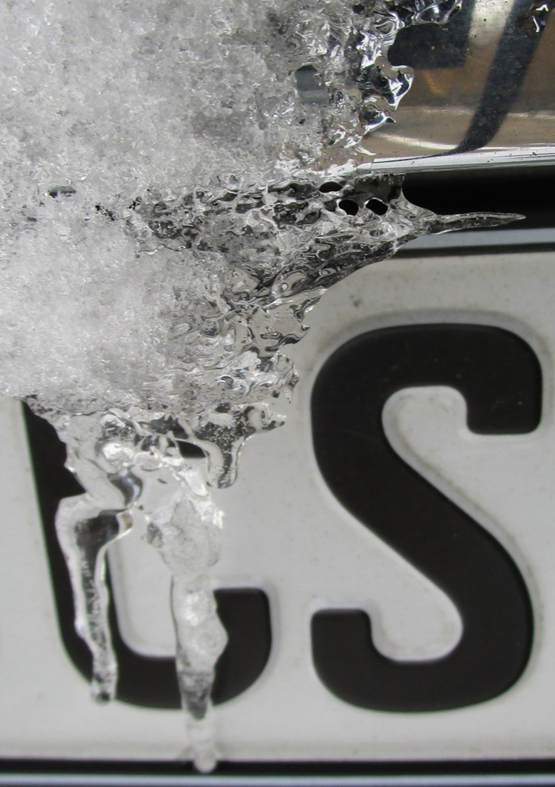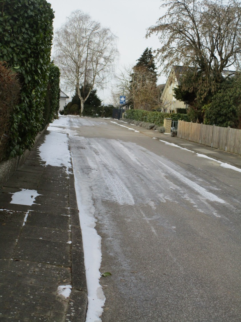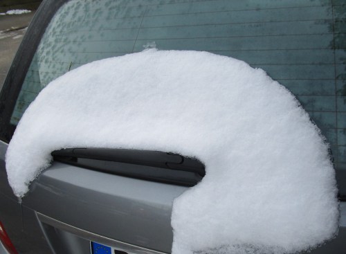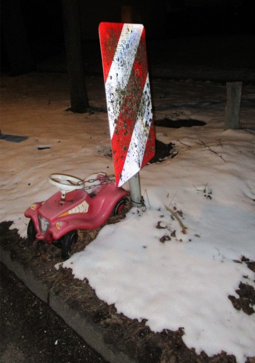 Draussen, in Eis und Schnee, aber bei freien Straßen wird ein kleines rotes Auto gesucht. – Dies ist es nicht.