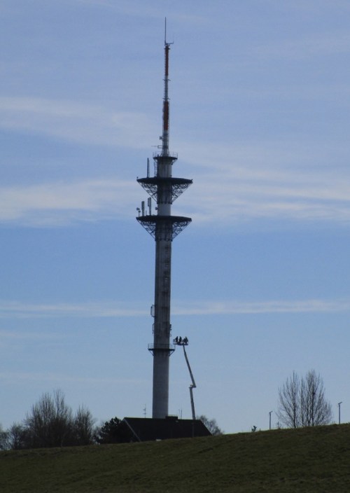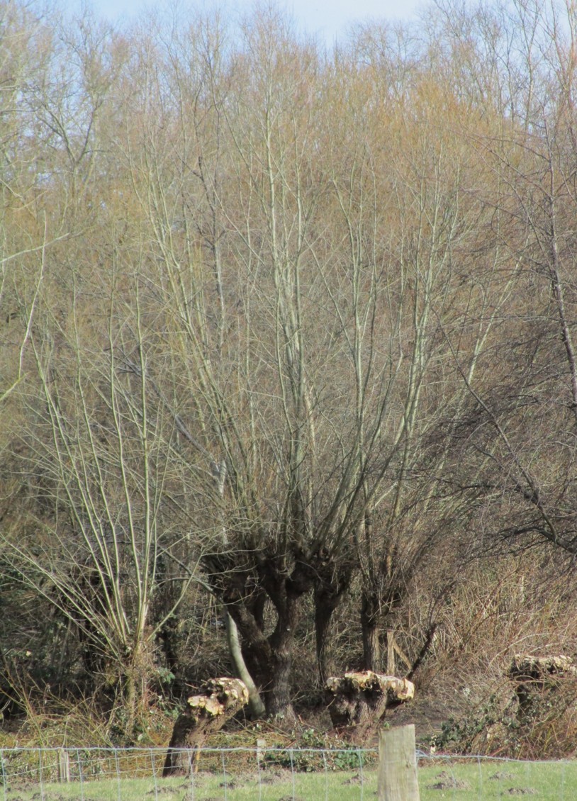 Quer zur Straße steht der Rest einer jüngeren Baumreihe – nebendran, professionell ein Bagger mit Haltegriff, auf der anderen Seite der Profi mit der Motorsäge. (Alles Buschwerk, vorn Hasel, ist dem „pflegenden“ Zugriff nach der 08/15- Methode „Kugelform = Hausmeisters Liebling“ zum Opfer gefallen. Wächst nach …)