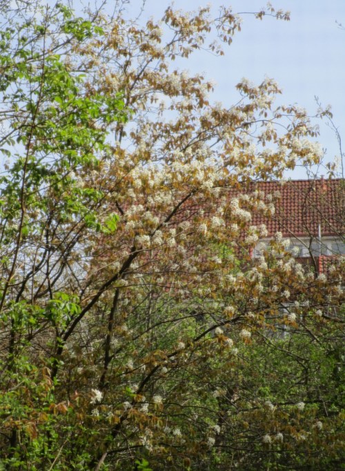 Raus zum Rad – auch vor dem Eingang gedeiht eine – noch ganz junge – Felsenbirne, blüht erstmals.