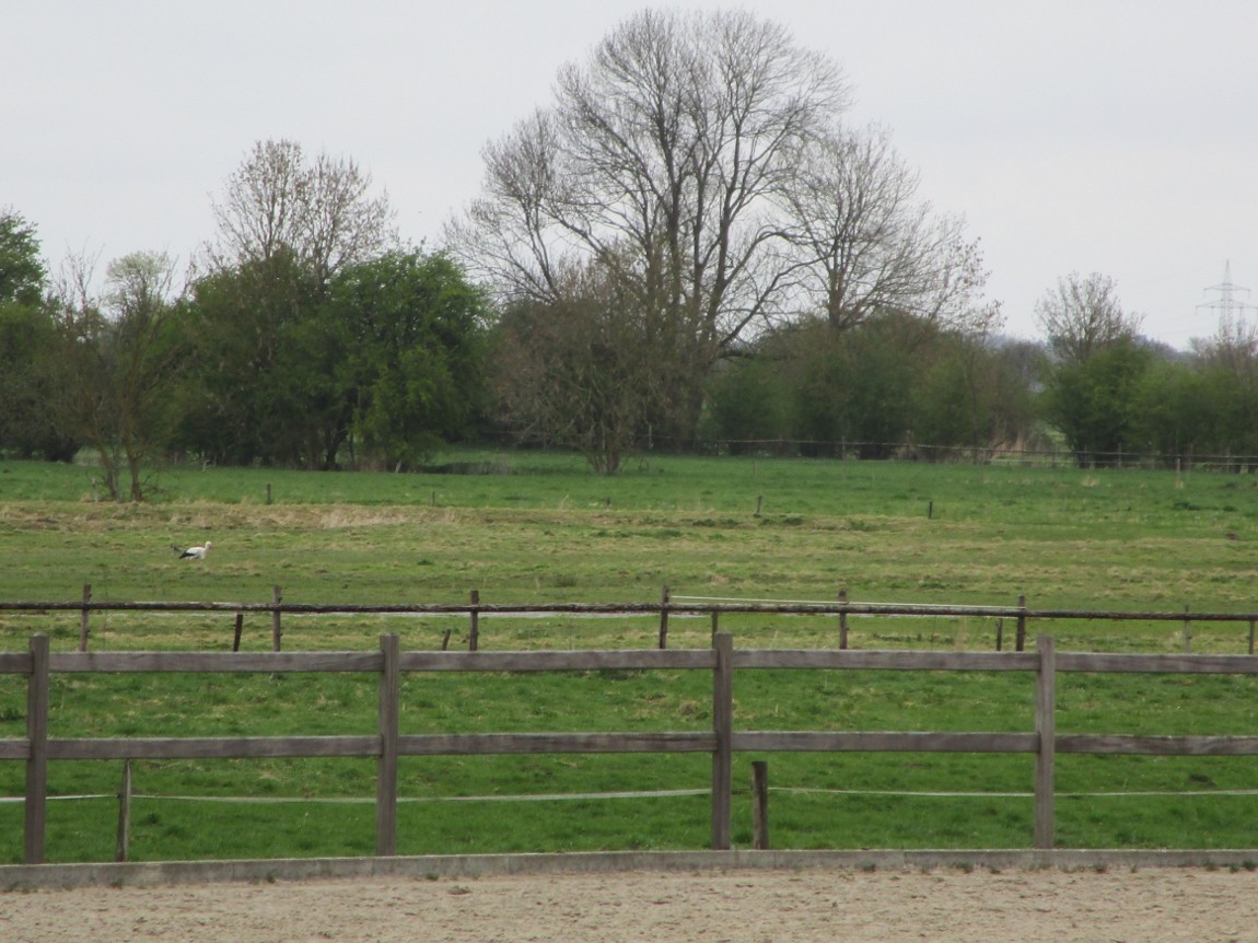 Der erste Storch, nach beobachtetem, wohl 10maligen Kreisen mit vergeblichem Nestanflug offenbar genervt, landet entfernt hinter dem Reitplatz auf einer Wiese.