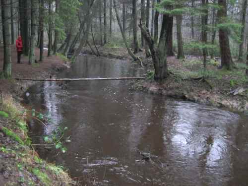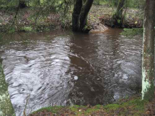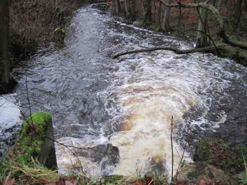 Erosion färbt das Wasser kaffeebraun. In naturnahem Gewässerzustand würden die Fluten das Gewässerbett verlassen, ihre Kraft verlieren und mitgeführtes Material ablagern.