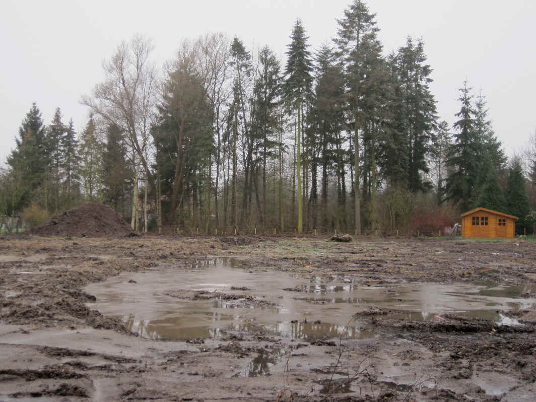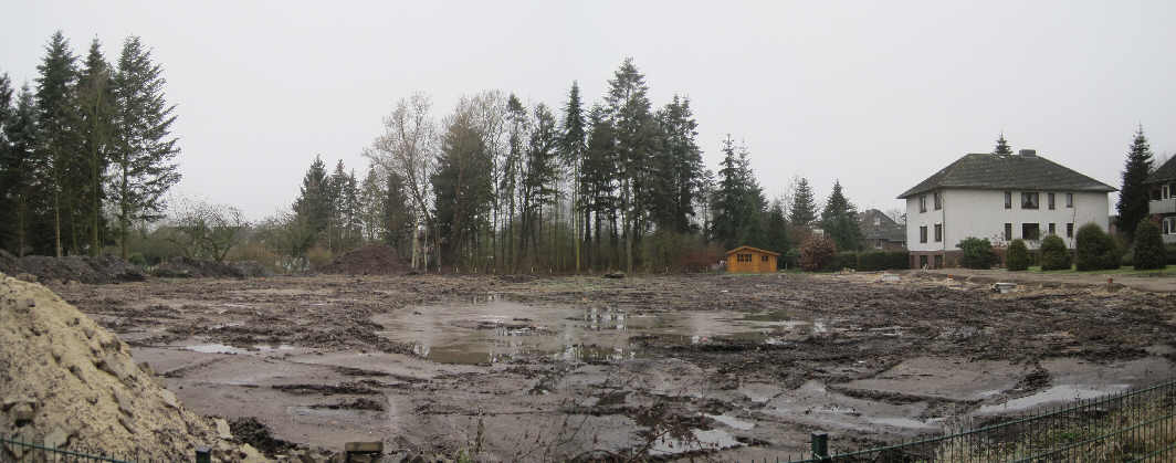 Nun gucken Sie sich das folgende Foto an – neue Baulandschaft nach Abräumen des vorher vorhandenen Nadelholzbestandes. Statt den wasserdurchlässigen, versauerten, organischen Oberboden quantitativ zur Seite zu packen, wurde mit Bagger in ihm herumgefahren, als wolle man eine Dichtungsschicht herstellen. Was denn auch gelungen ist – die Niederschläge stehen als See „auf dem höchsten Punkt“. Na denn man gute Gartenarbeit!