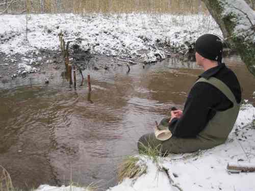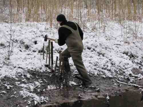 Zufriedener Hölzchen-Künstler - wichtig ist die Einbindung bis hoch in den Uferbereich, vgl. Artikel vom 9. November 2009.