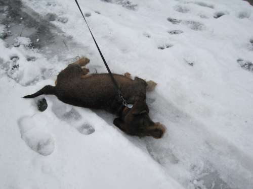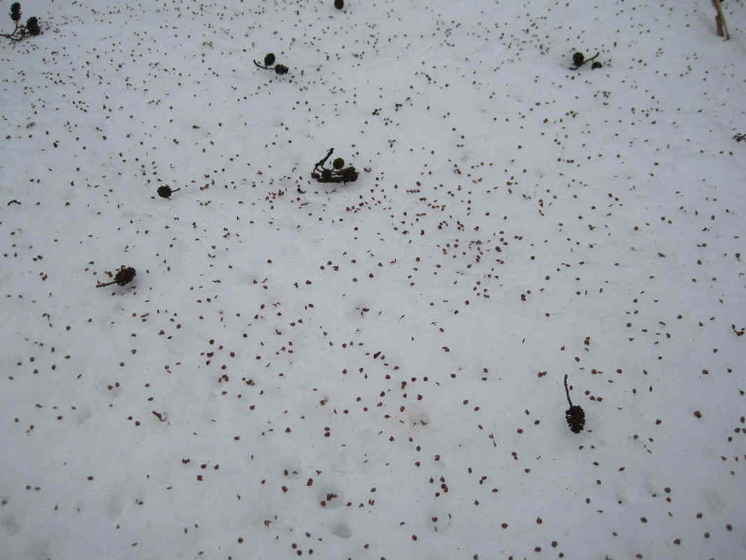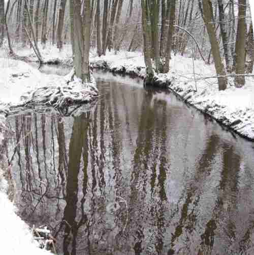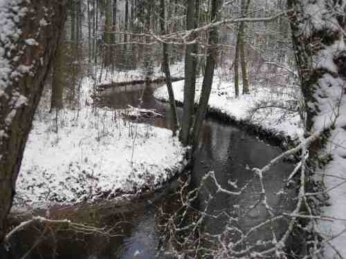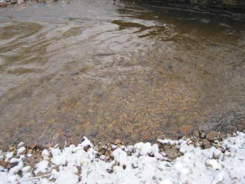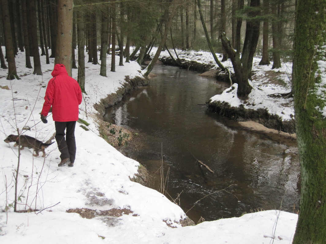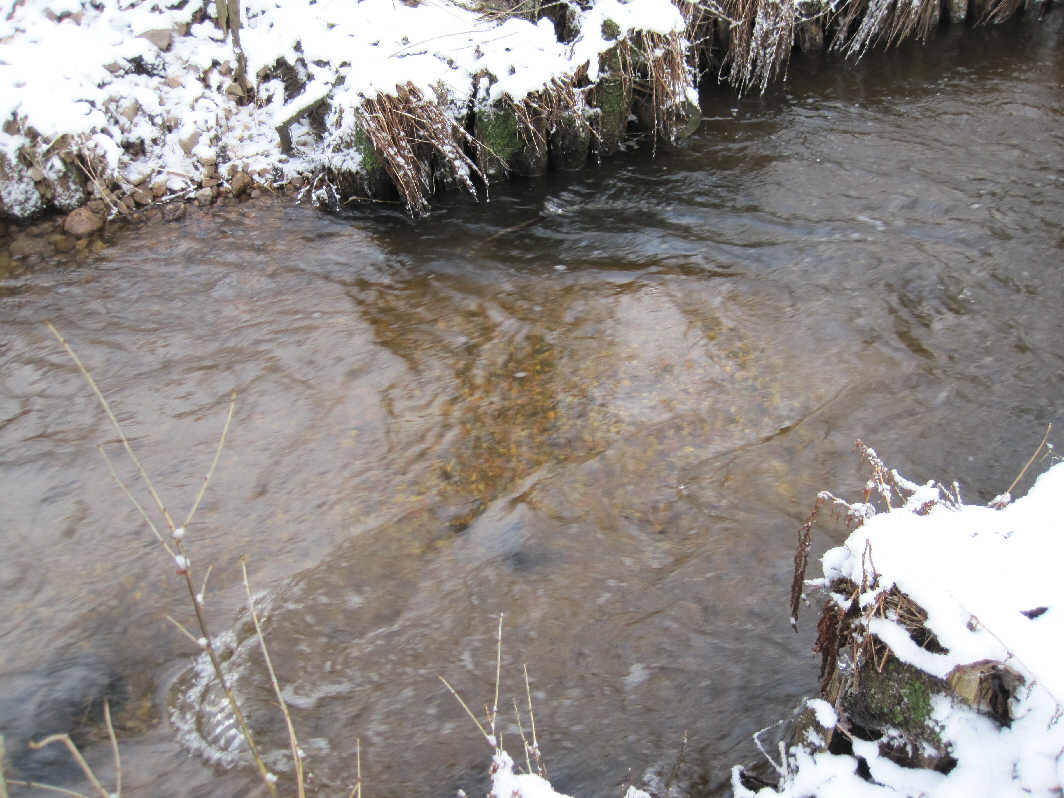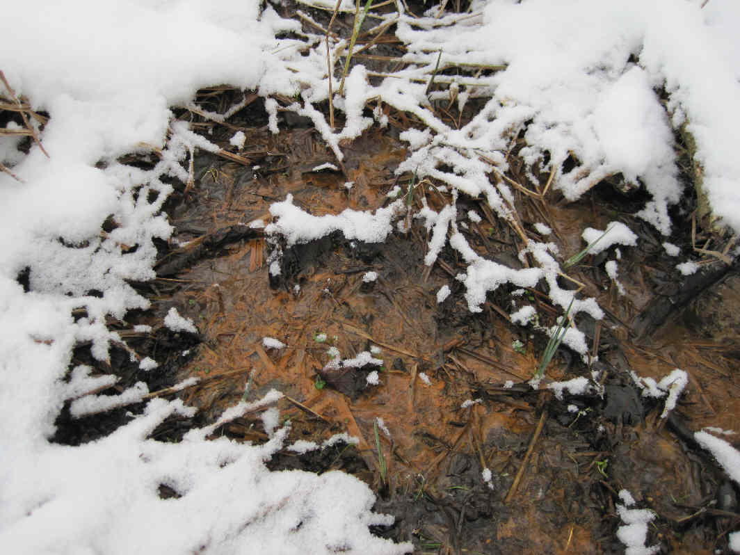 Grundwasseraustritte mit Ausfällung von Eisenocker leuchten im Schnee.