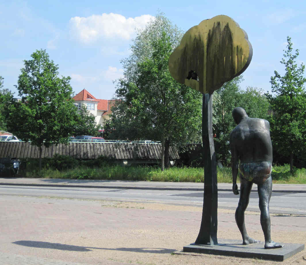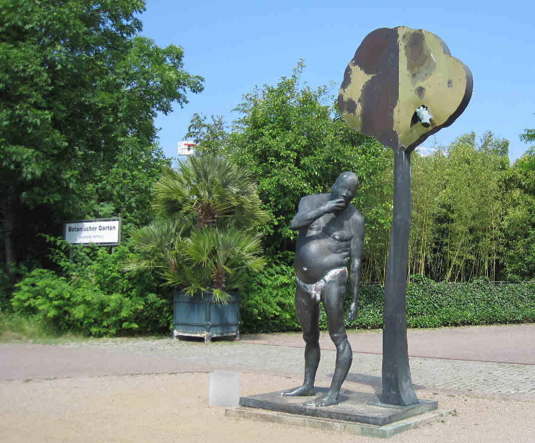 Der Eingang des Botanischen Gartens in Klein Flottbek, Hamburg. Was will uns der Mann mit dem Apfel (?) sagen. Vielleicht erst einmal nichts – er hat ja den Mund voll.