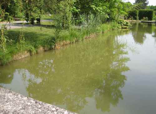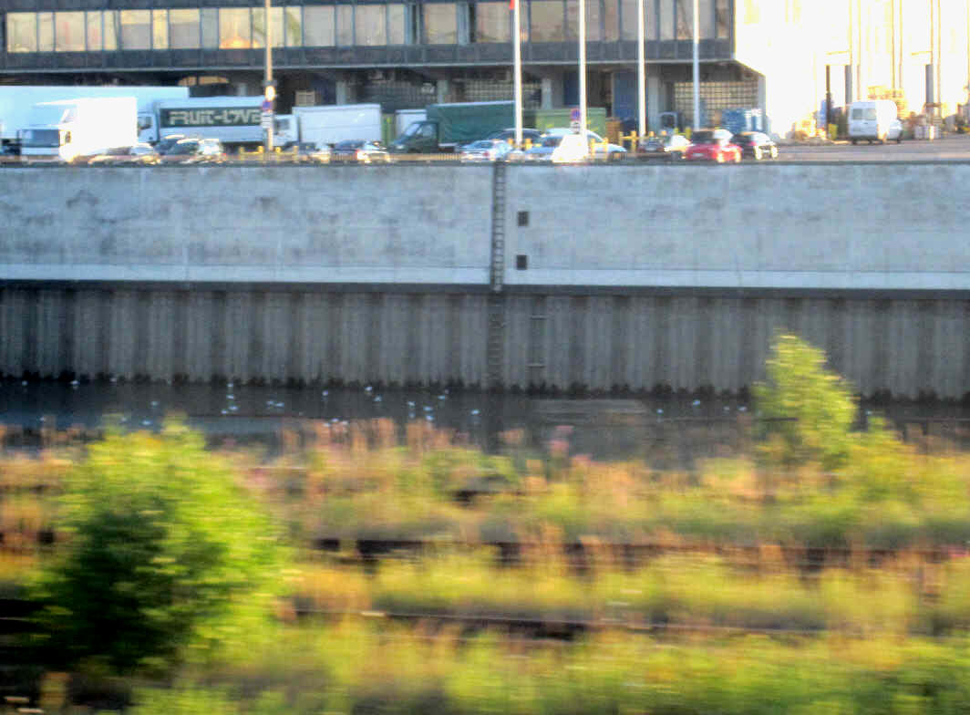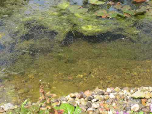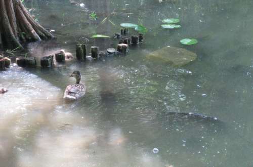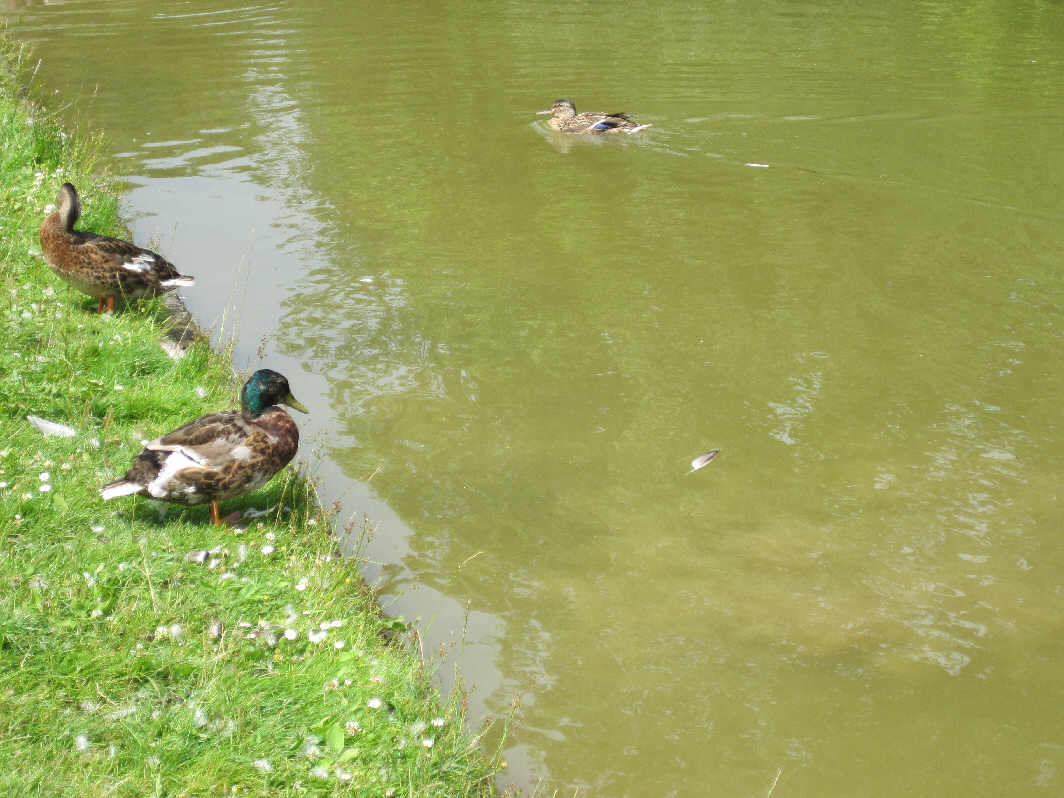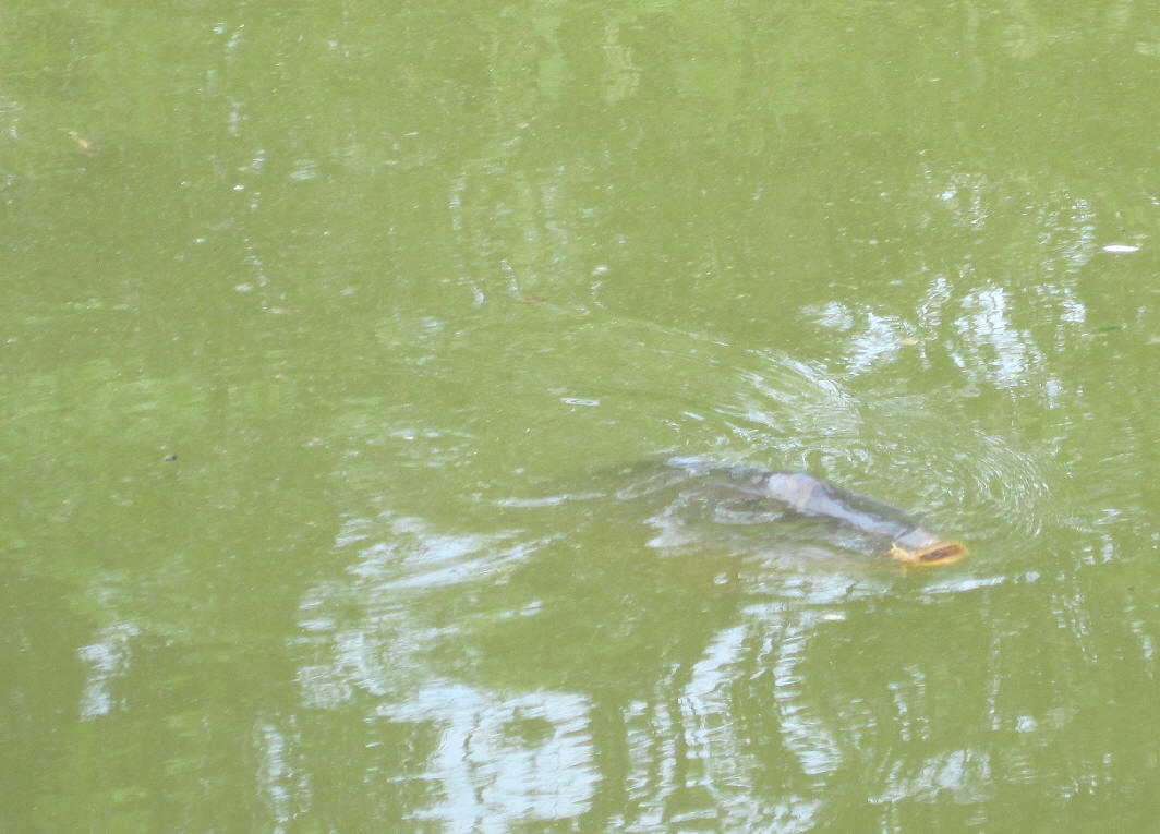 Typisches „Ensemble“ für den schmutzigen See: Enten und Karpfen. Dementsprechend sieht das Wasser auch aus.