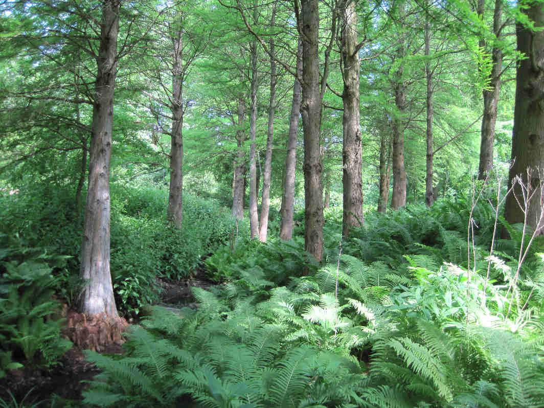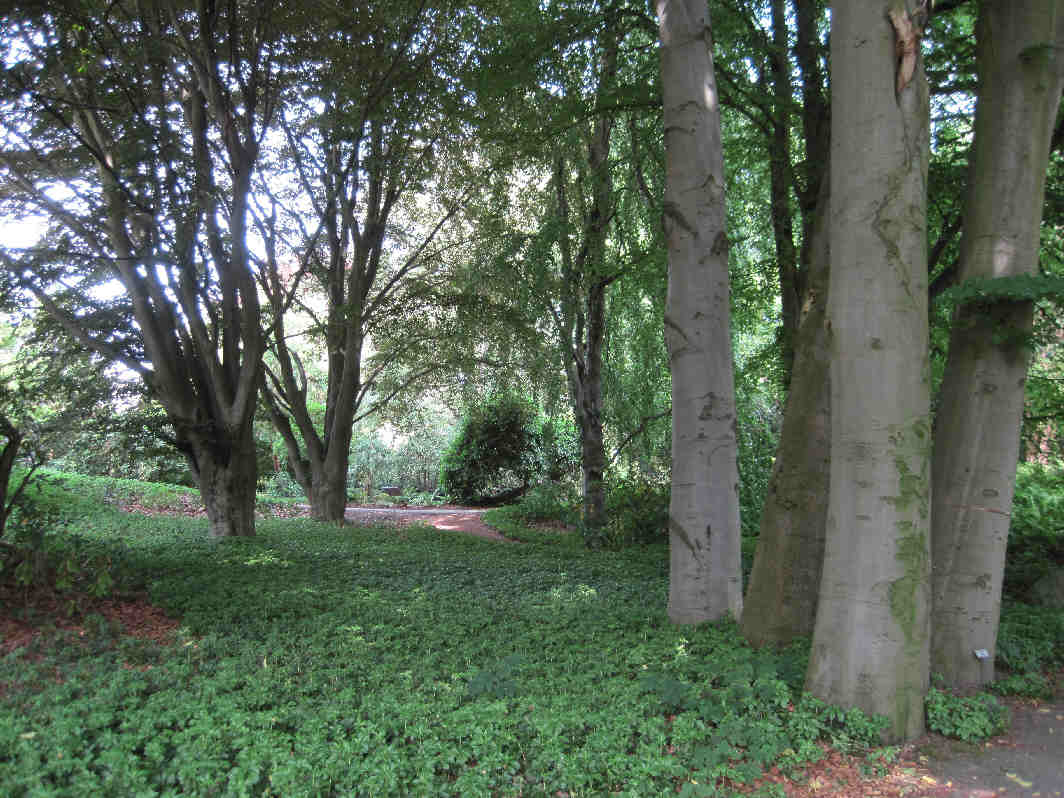Dass es auch anders geht, zeigt die Nordamerika-Sektion im Botanischen Garten. Licht und Schatten entlang des Bachtals.