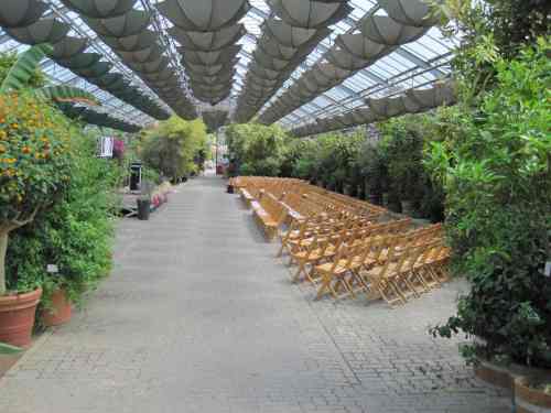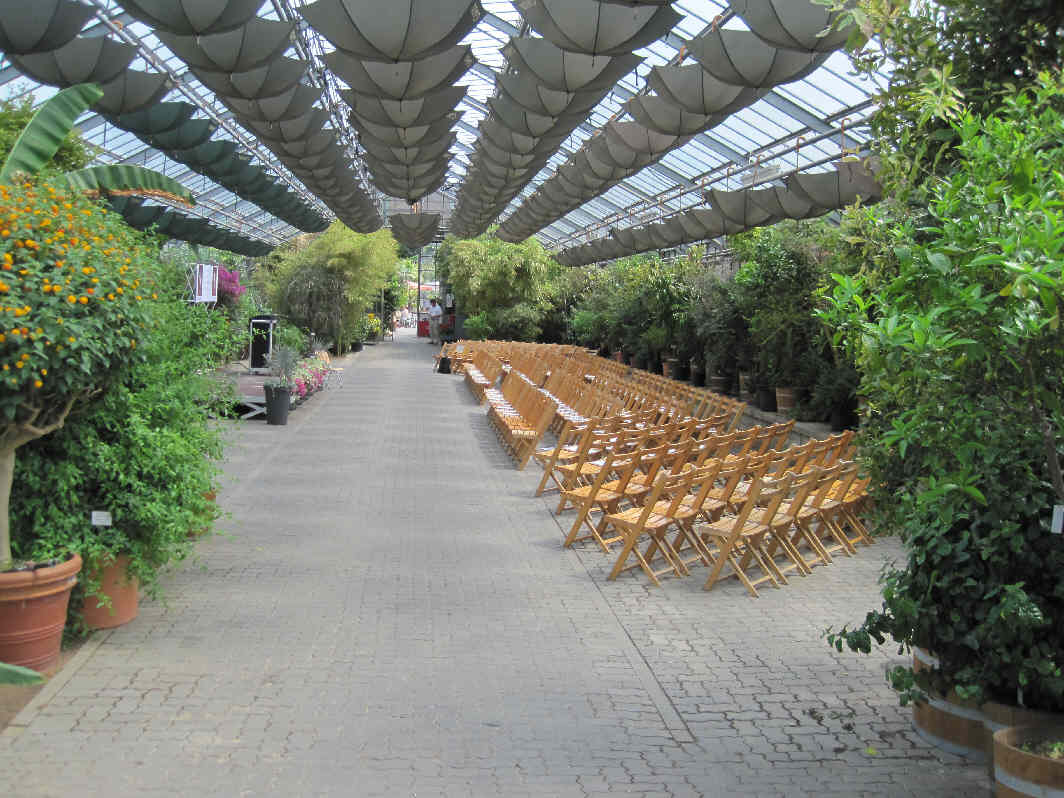 Der Veranstaltungsraum, Schirm-teilbeschattet und unbesetzt. Ein Lüftchen weht durch, noch lässt es sich hier aushalten.