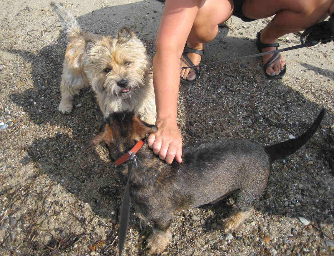 Freundliche Begegnung am Sonnenstrand: Cairn-Terrier und Rauhaardackel.