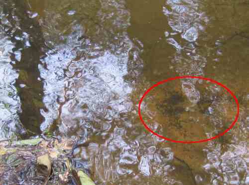 Zwischen bewegtem Sand in der Strömung und beruhigten Seitenflächen haben sich offenbar massenhaft Tiere angesiedelt (Kreis). Die Probe mit dem Küchensieb wird zeigen, um wen es sich handelt.
