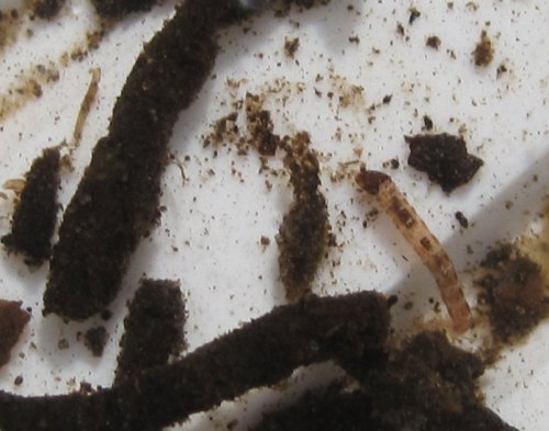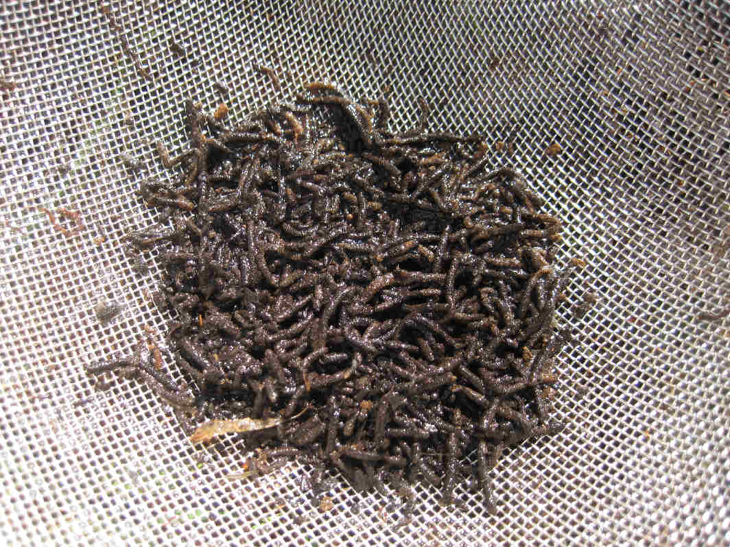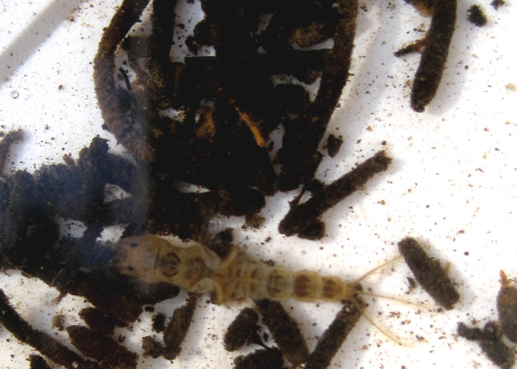 Sieh an, eine Larve der Großen Maifliege krabbelt zwischen den Röhren herum. Wo dieses, mehrjährig sich unter Wasser entwickelnde Tier hausen kann, scheinen keine allzu schlechten Bedingungen zu herrschen.