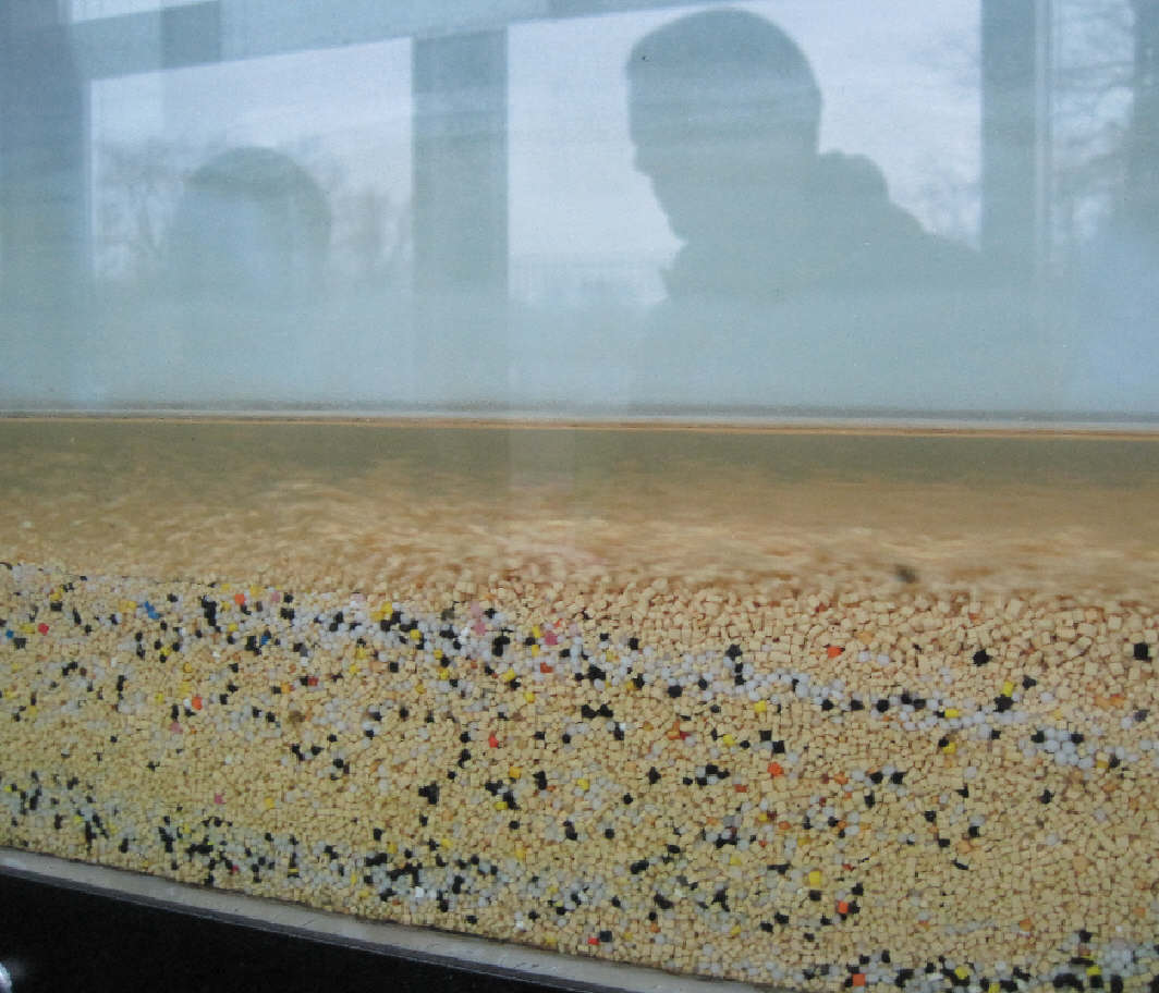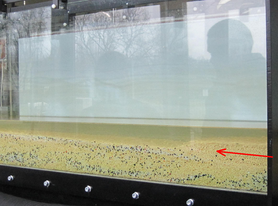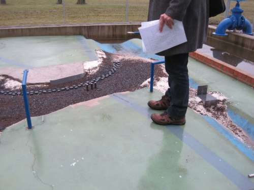 Probleme hausgemacht - Uferverletzung, -absturz, Sandtrieb. Die in der Bildfolge oben beschriebene Gewässerbreiten-Verdopplung resultiert in weiter unten mit hohem Kostenaufwand zu baggerndem, dort den Abfluss störenden Boden.
