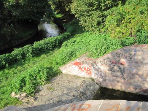 Extremes Ufer muss nicht hoch sein - eine Spundwand "reicht" auch schon. Überbreite und fehlende Struktur des Gewässergrundes lassen die Panke hier als Sand-Schlamm-Kanal erscheinen.