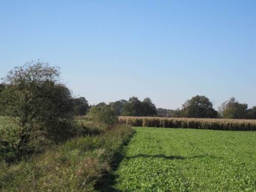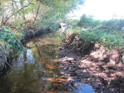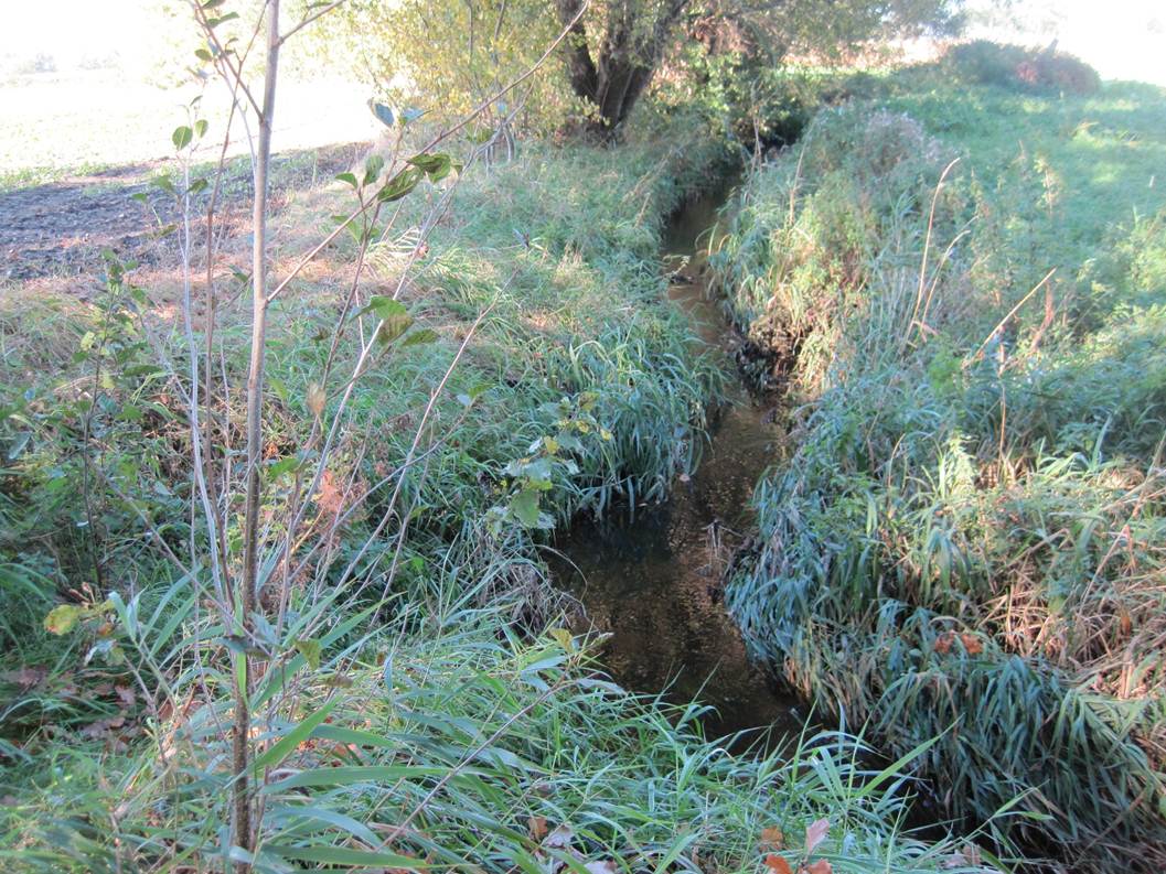 Bedrohung für Gewässer: Ackerbau bis an die oberste Uferkante. Gewässerrandstreifen müssen endlich überall an Bächen eingefordert werden einschließlich ihres standorttypischen Gehölzsaums.