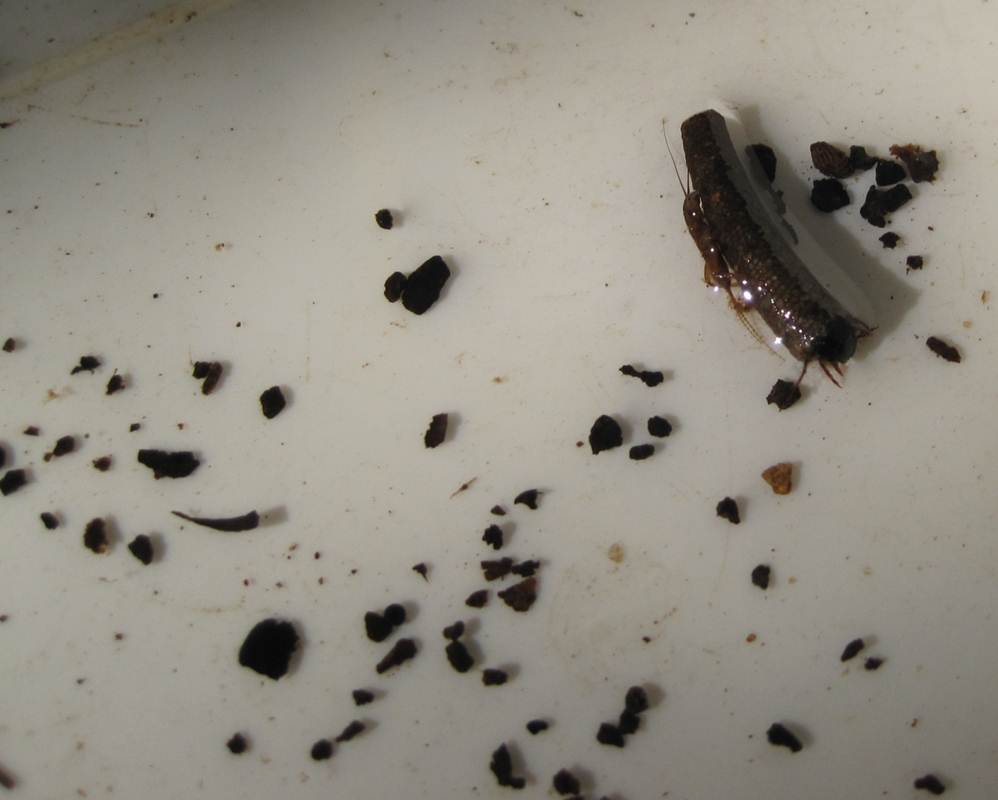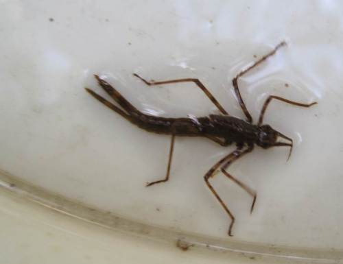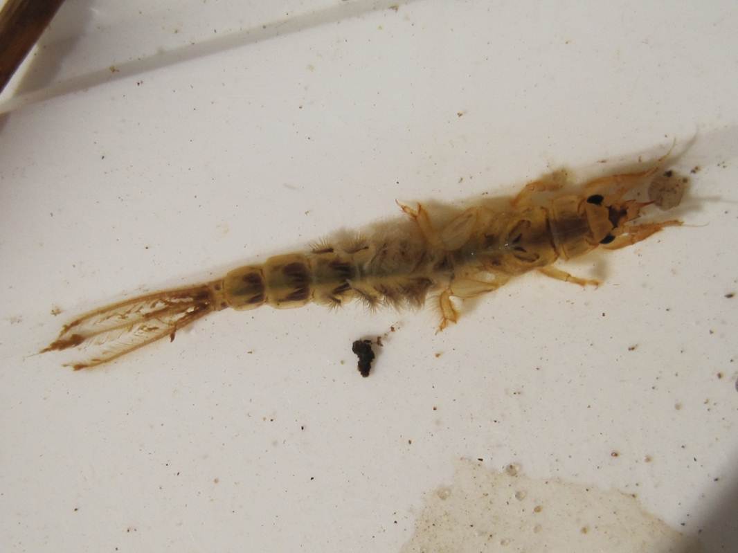 Die Untersuchung von Wirbellosen im Bach gestaltete sich allerdings schwierig - es tauchten zunächst keine (!) Organismen beim Absieben von Uferbehang und Gewässersohle auf, obwohl alles optisch sehr vielfältig erschien. Endlich wurden einzelne Larven der Großen Maifliege Ephemera gefunden, 3 Größengruppen, hier die älteste.