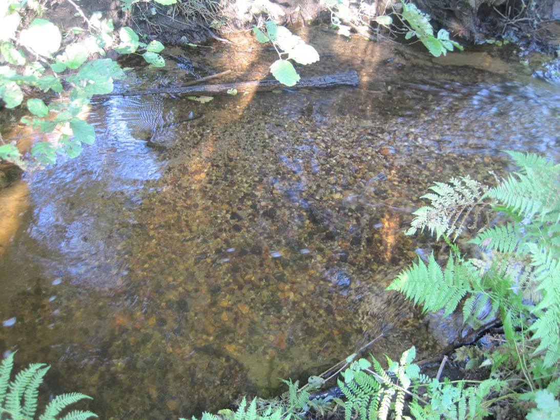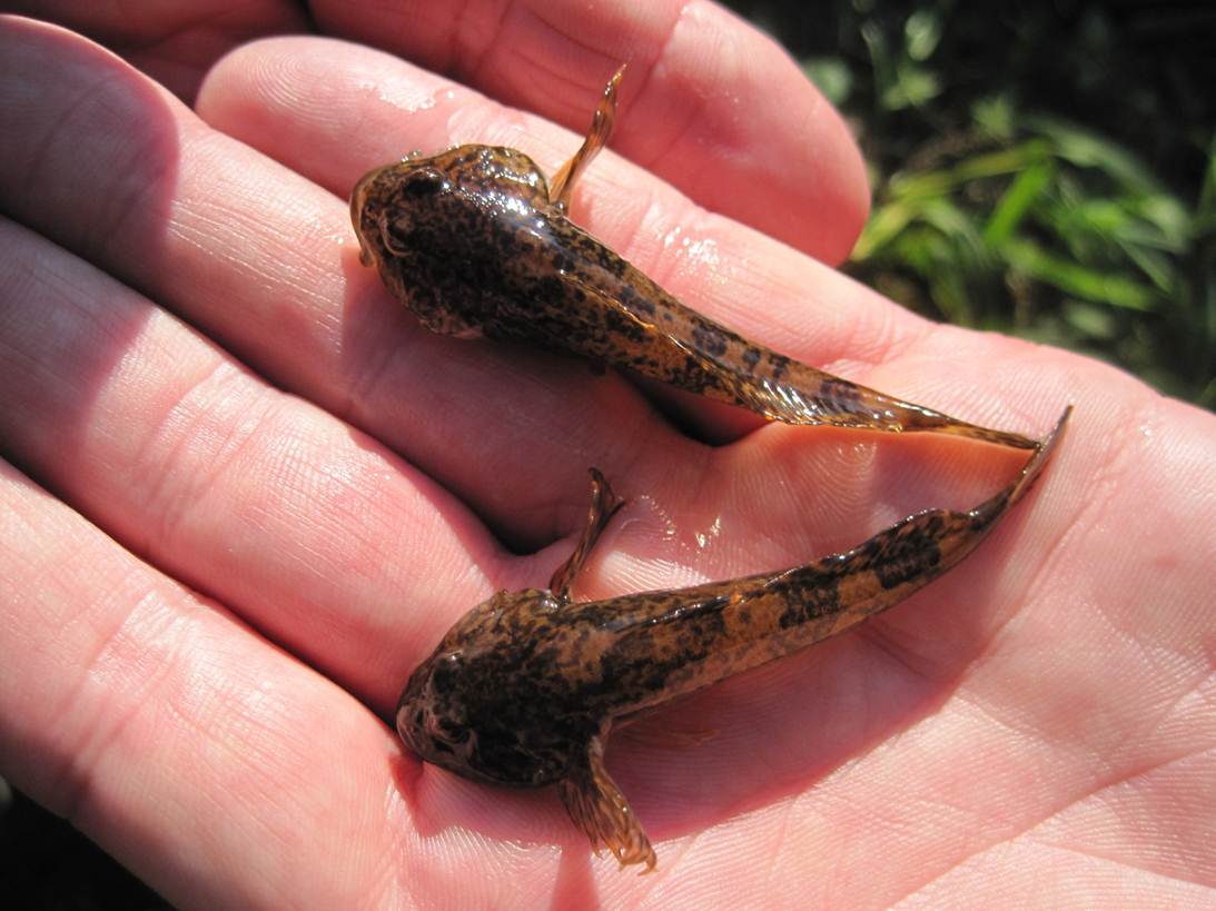Wie sich das für einen anständigen Laich- und Aufwuchsbach der Forelle gehört, kommt als Begleitfisch die Mühlkoppe vor - schön zu sehen, wurde dieser Fisch doch aus falsch verstandenem Konkurrenzdenken jahrzehntelang bis zur Ausrottung verfolgt.