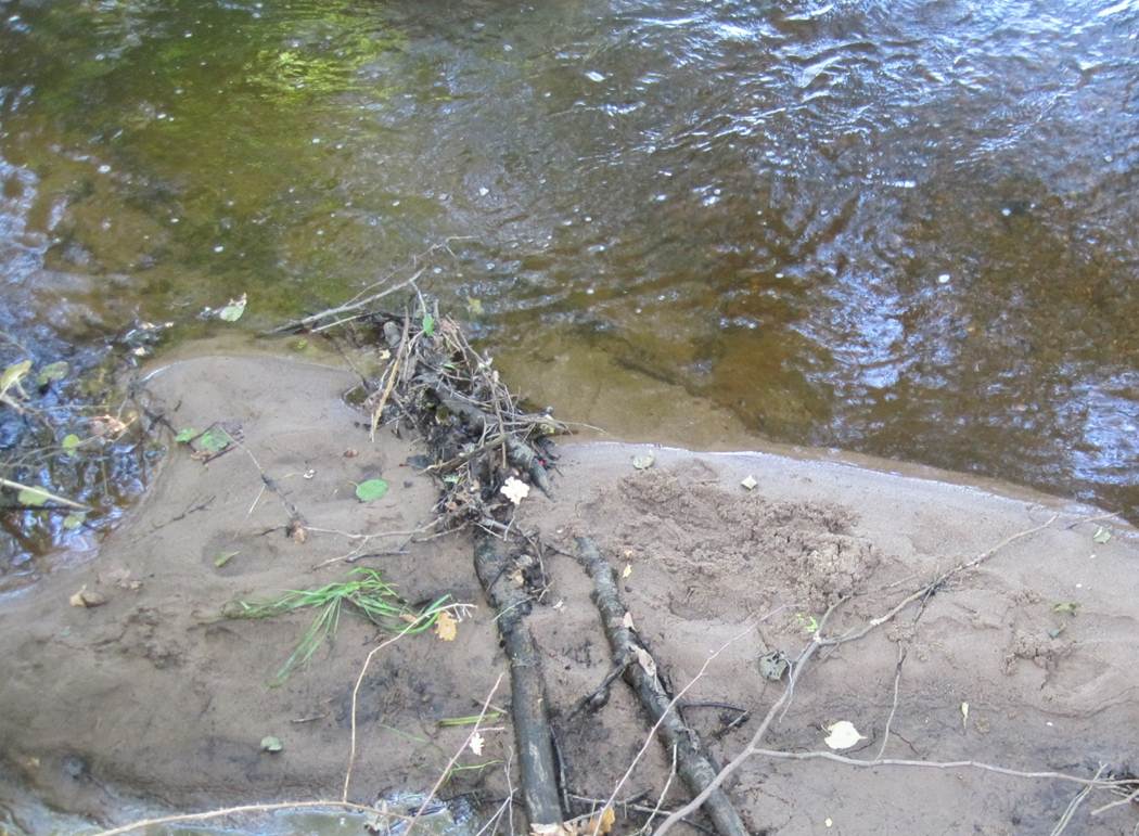 Hilfsweise können Treibselsammler z.B. aus Stöcken den charakteristischen Bachquerschnitt wieder herstellen. Der Haselstecken zeigt, wie weit ein solcher Sammler auf Mittelwasserniveau in der Gewässersohle von rechts kommend gesteckt werden kann.