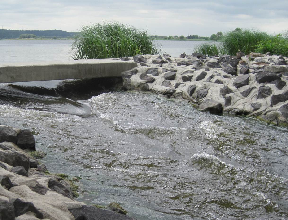 Auch zwischen dem rauschenden Hauptabfluss der Elbe (ganz links) und dem unteren Ende des Fischpasses (ganz rechts) wird durch zusätzliche Überläufe Lockströmung Richtung Fischpasseingang erzeugt.