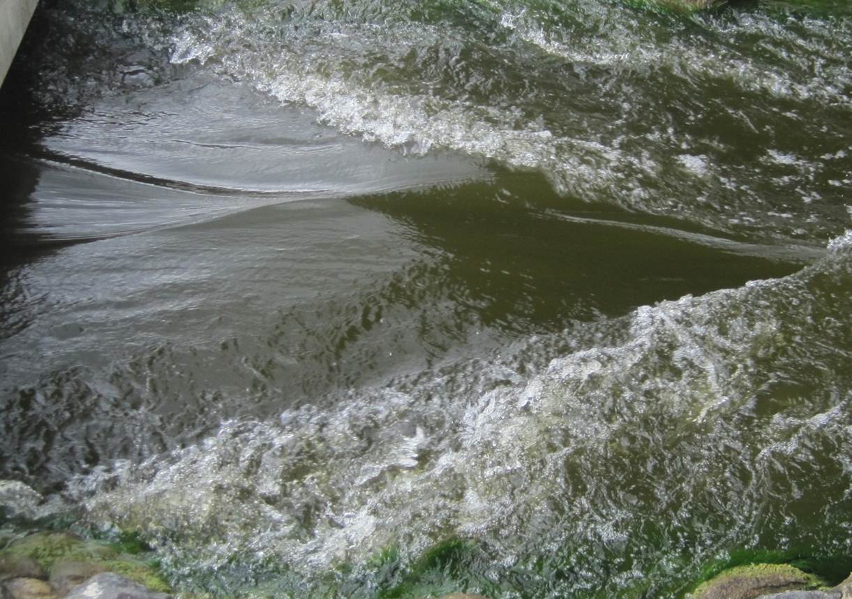 Besonders im oberen Bereich der sogenannten Dotierungsgerinne zeigen sich interessante Strömungsbilder. Hier zum Start eine Übersicht mit „Kamm-Welle“ rechts im Vordergrund.