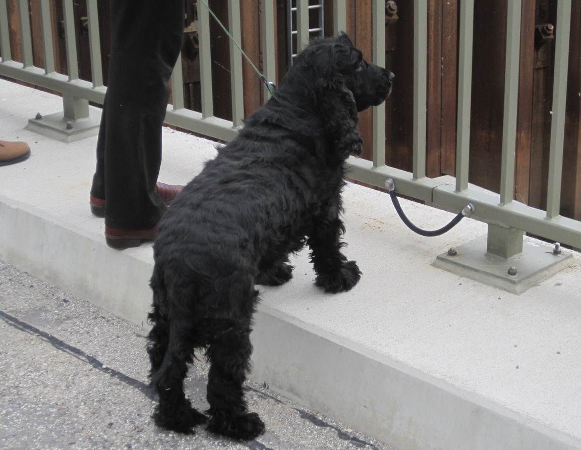 Das türkise Teil des vorigen Fotos hier im Gesamteindruck: eine mit Bürsten zum Durchschlängeln ausgestattete Aalleiter.