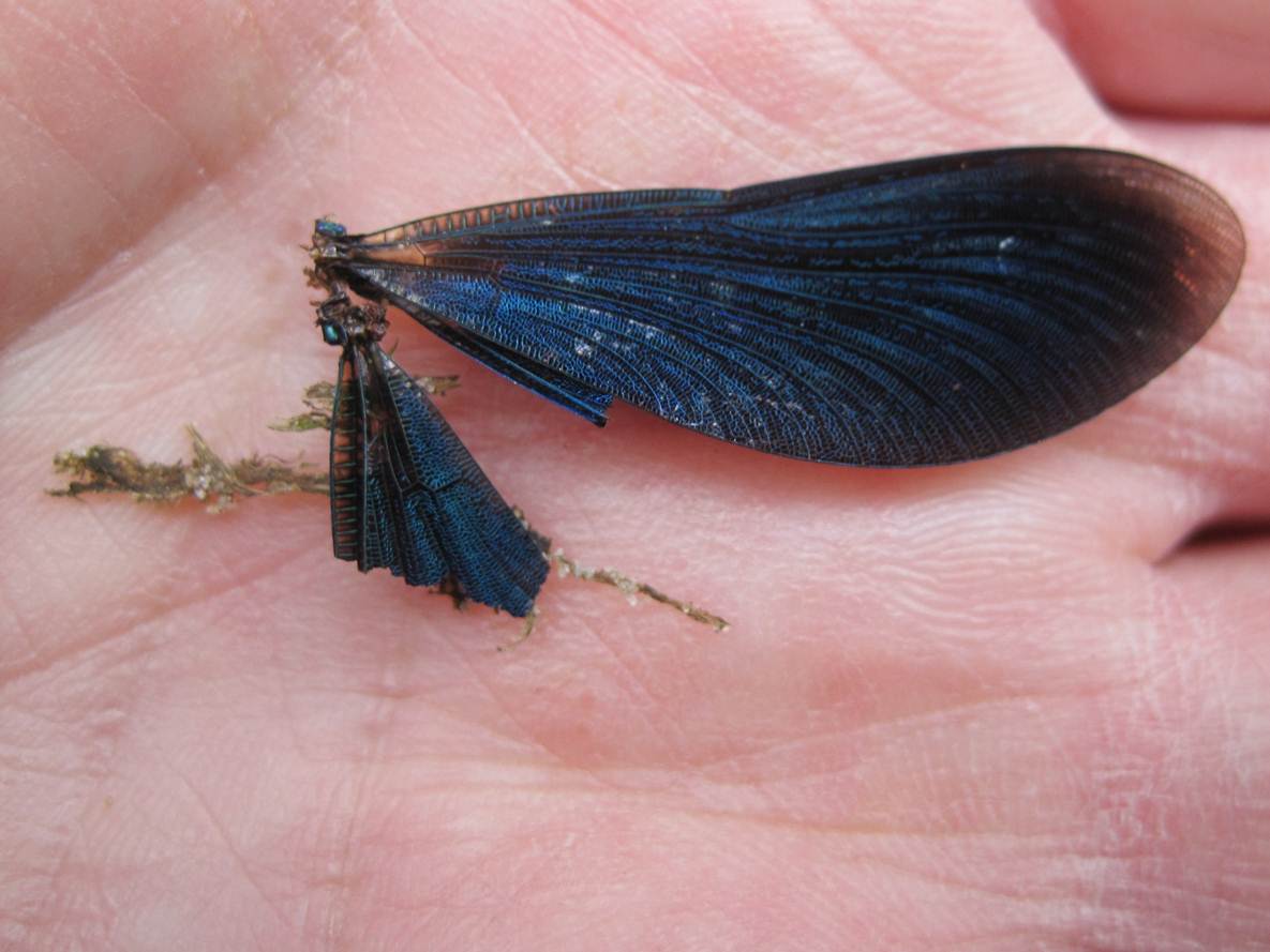 Der frühere Nutzer dieser Flügel, ein Prachtlibellenmännchen der Art Calopteryx virgo, war wohl von einer größeren Libelle oder einem Vogel genossen worden.