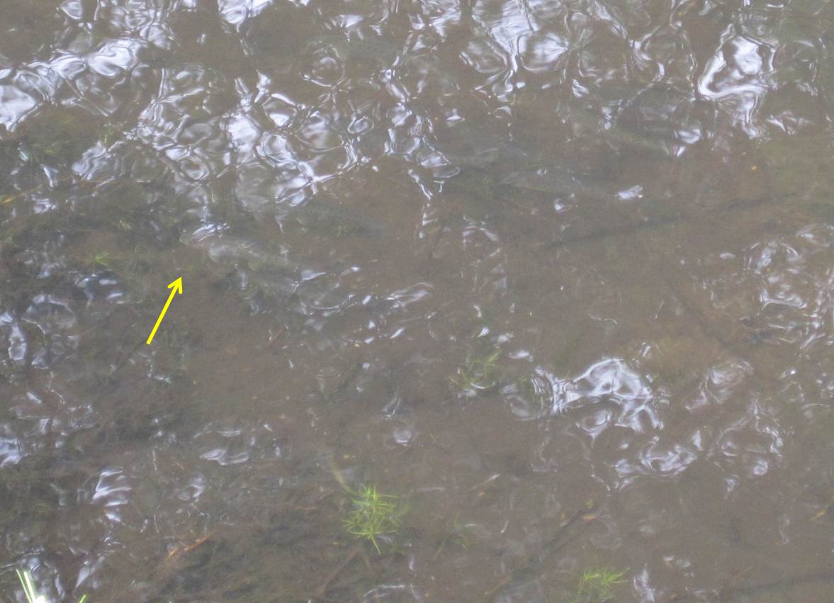 Sofort nach dem Freilassen orientieren sich die Jungfische zwischen Grund und Pflanzenpolstern. – Wer nichts erkennt, klickt mal auf`s Foto – das wird dann groß.