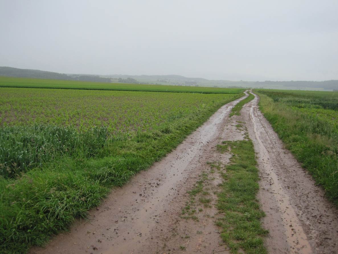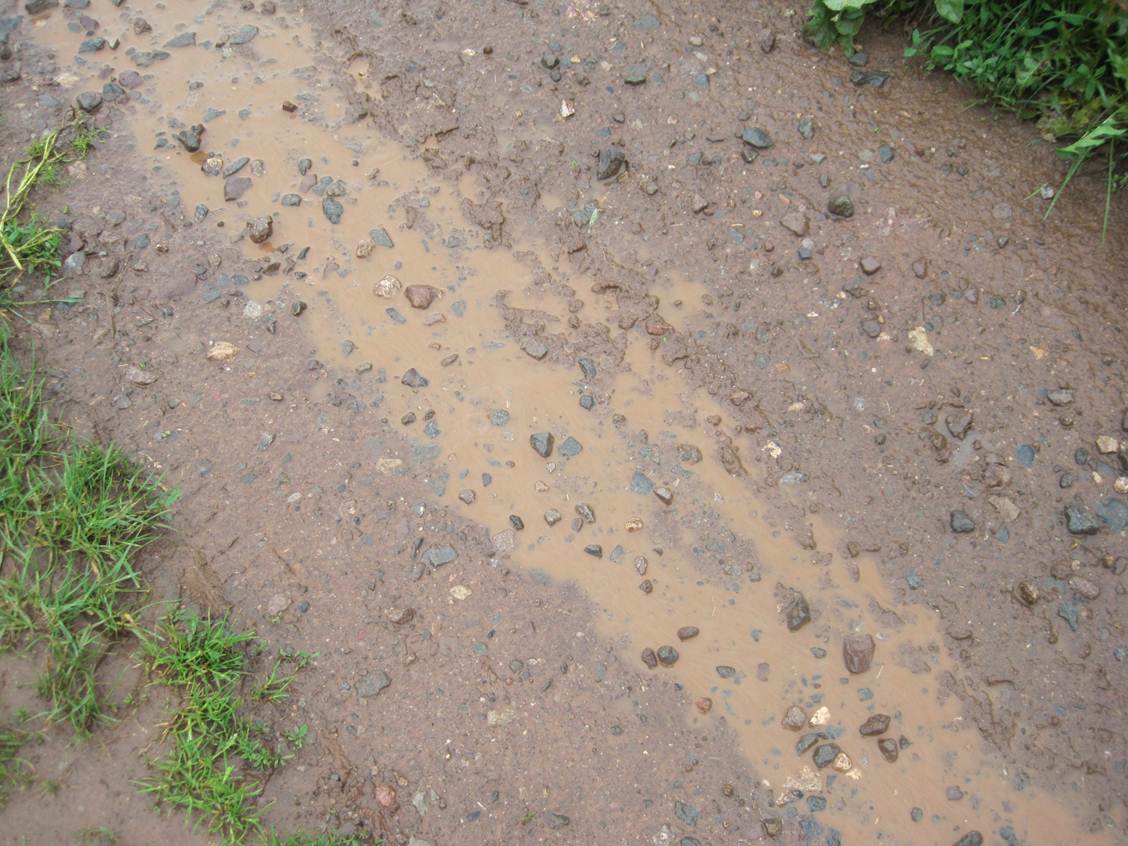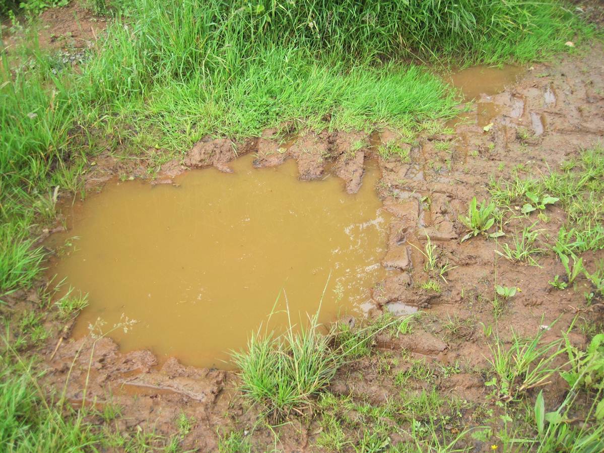 Von der Seite aus unbefestigtem Weg kommt ein erdbrauner Zufluss – Hundewetter!