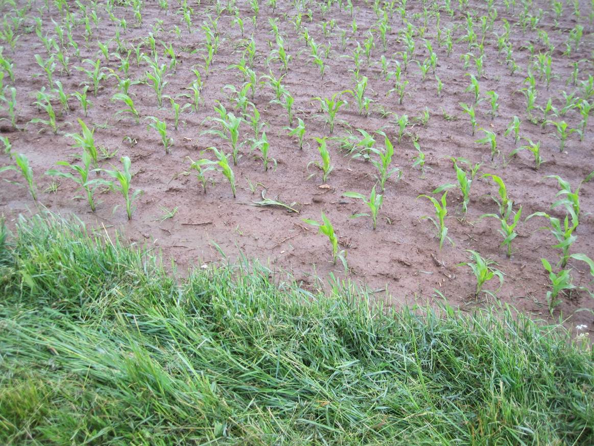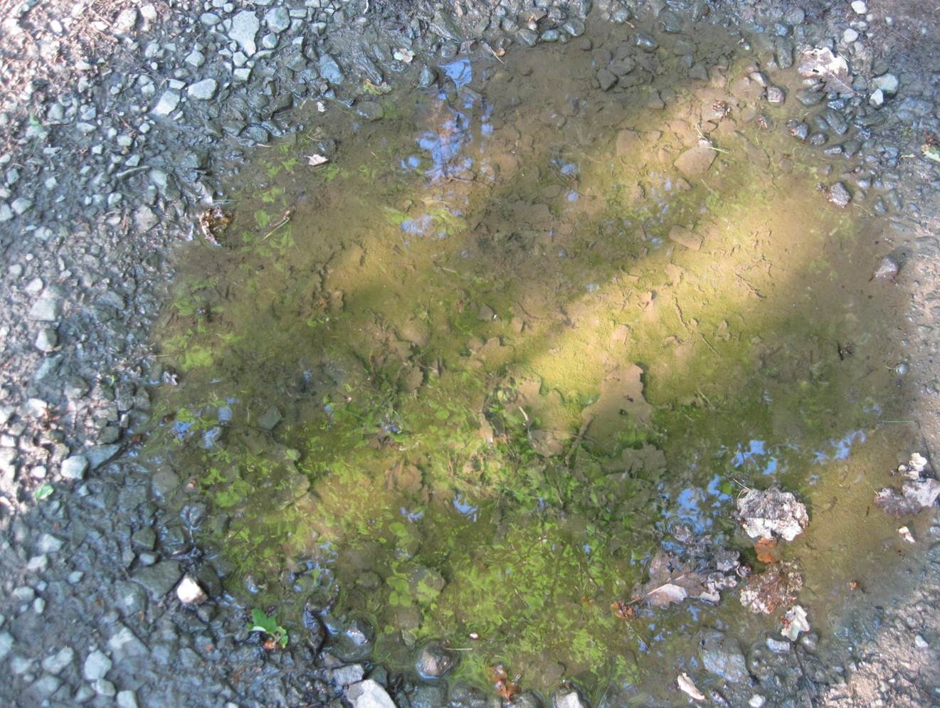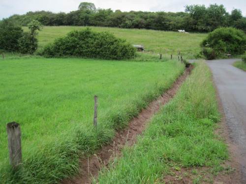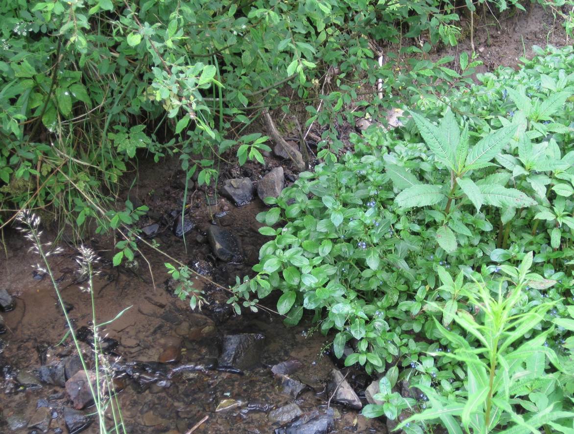 Von der Seite aus unbefestigtem Weg kommt ein erdbrauner Zufluss – Hundewetter!