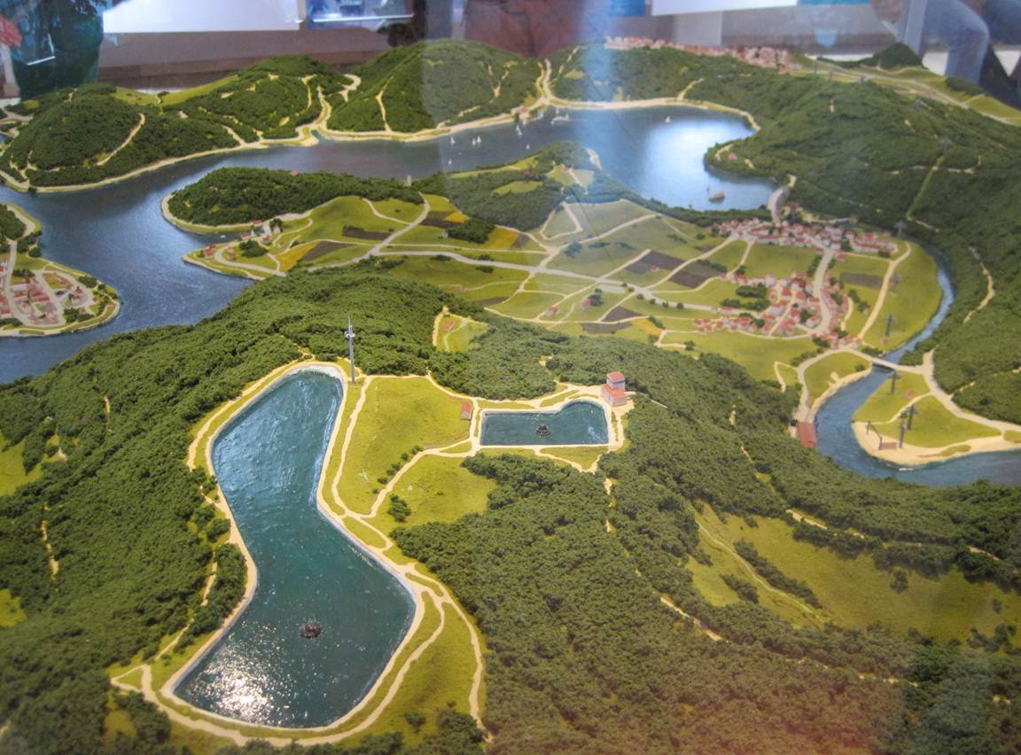 Also gehen wir erstmal ins Infozentrum und lassen uns über Wasserkraft im Allgemeinen und im Speziellen informieren. Hier das Modell der Speicherbecken auf der Bergspitze, dahinter der östliche Teil des Edersees.