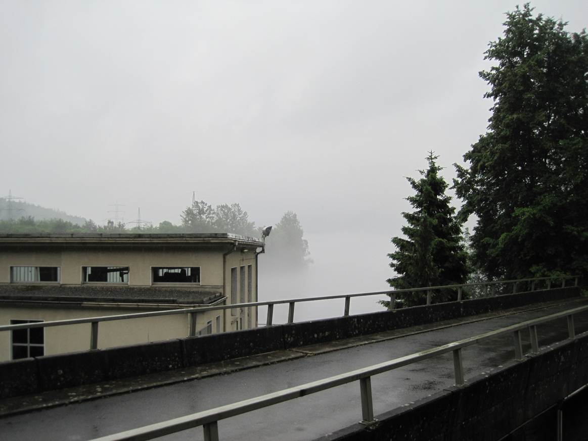 Tief fliegen die Wolken, Nebel hängt über dem Edertal, Affolderner See.