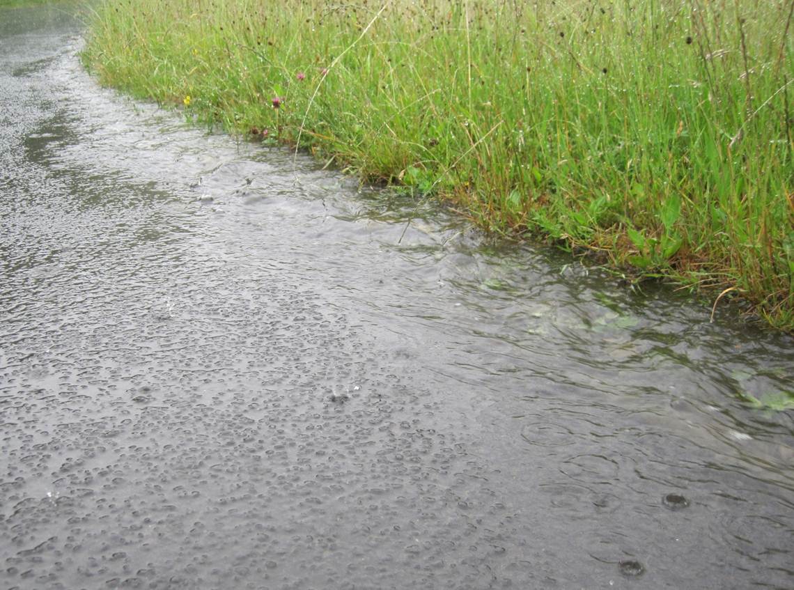 Wenn`s weiter nichts zu sehen gibt, konzentriere ich mich eben auf die Nähe: Sturzbach rast die Straße runter.
