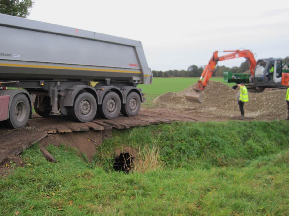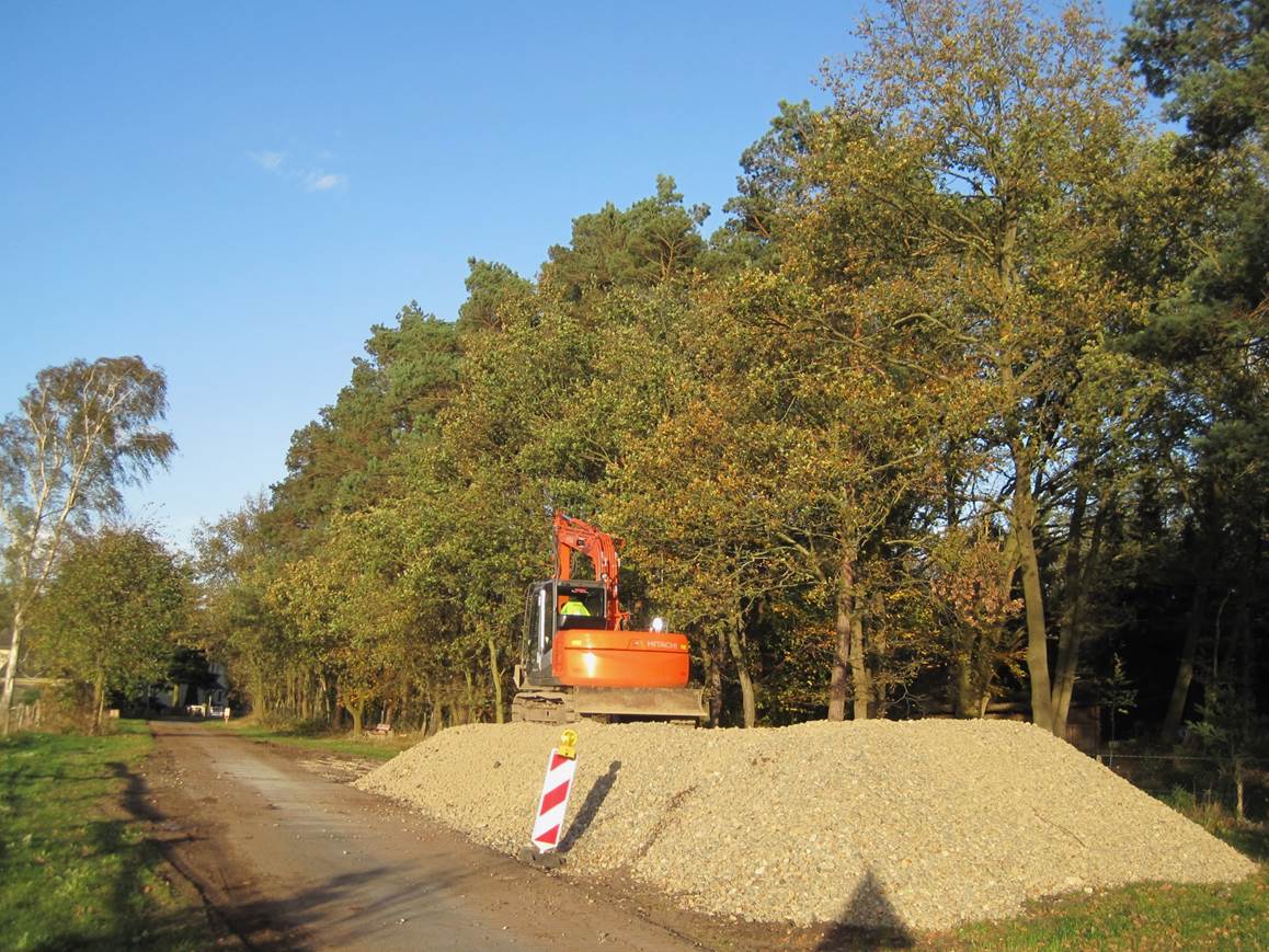 Hunderte Tonnen Kies und Geröll werden vor Ort geliefert. Die Rohrüberfahrt ist angesichts des hohen Gewichts gesichert.