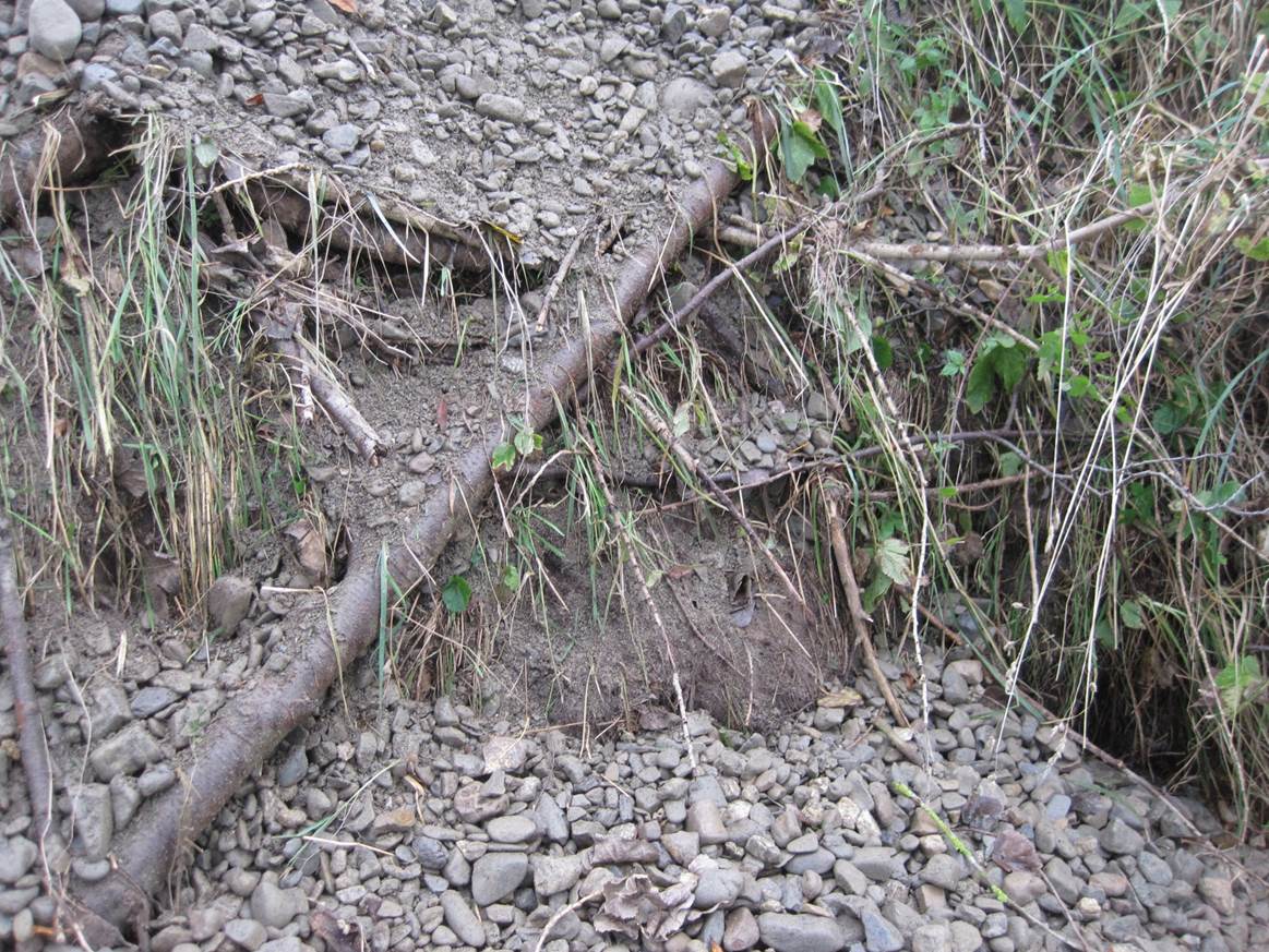 Dazu werden – Fahrrecht wurde nur für diese Uferseite vereinbart – am anderen Ufer Markierungen angebracht (beachten Sie die fast unvorstellbare, durchweg gegebene Steilheit des Ufers und Tieflage des Flusses), für den Fall, dass die Ökologische Baubegleitung einmal während des Einbringens nicht vor Ort ist.