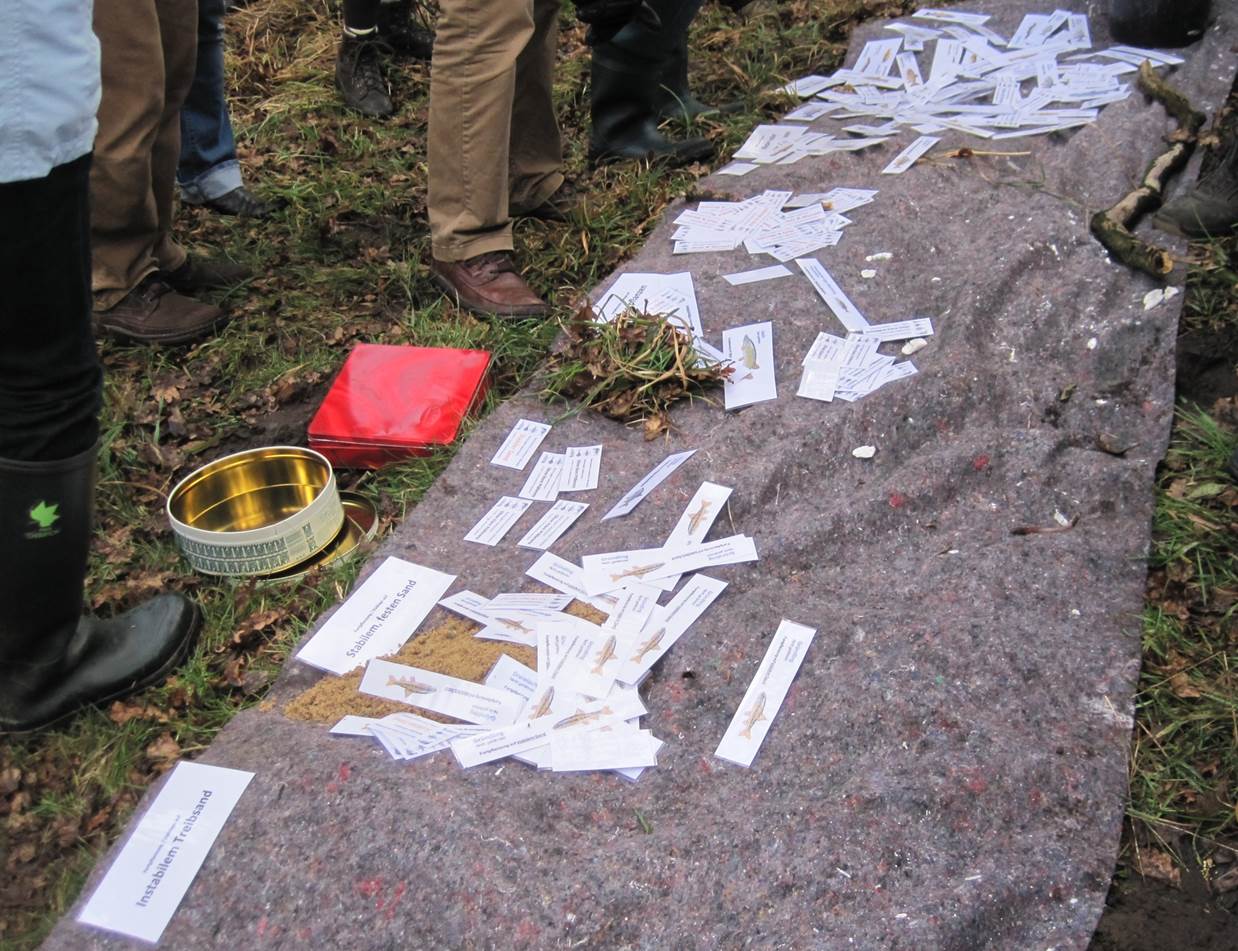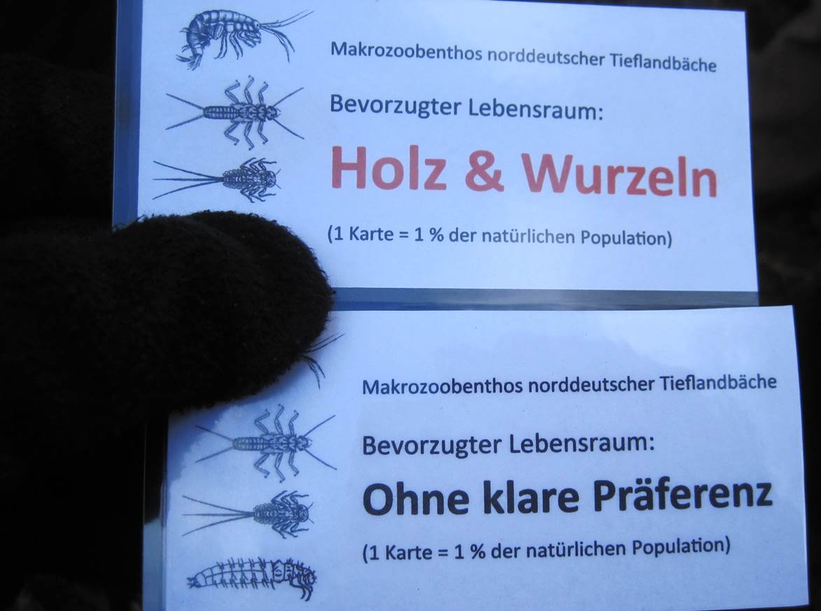 Ralf Gerken, Landessportfischerverband Niedersachsen, führte auf der Exkursion zur Fintau, einem Nebenfluss der Wümme, die Entstehung der Geest, einer charakteristischen Eiszeiten-gestalteten Landschaft vor. Kärtchen standorttypischer Fische und Wirbellosen (jedes Kärtchen repräsentierte 1 % der Lebensgemeinschaft) wurden von den Seminarteilnehmern unterschiedlichen Gewässersohlenstrukturen zugeordnet. Sehr deutlich trat die Bedeutung von Kies/Geröll und Holz/Wurzeln/Totholz hervor. – Mehr dazu in den folgenden Fotos.