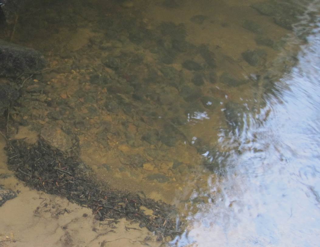 Noch einmal im Detail die Meerforellen-induzierte Sohlstruktur vor individueller Alt-Erle: Strömung von rechts, das von den Laichfischen „gegrabene“ Strudelloch, abwärts der rauschende Kiesberg mit den Eiern drin.