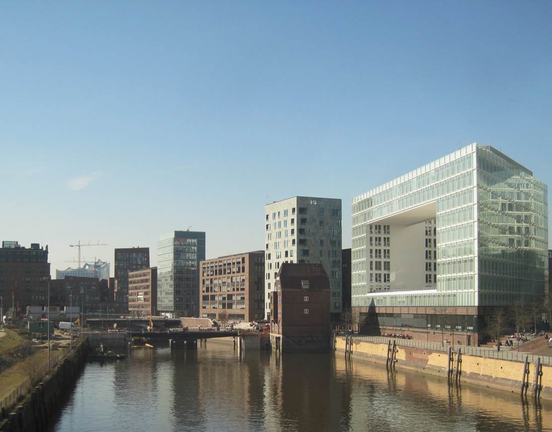 Über die Norderelbbrücken, Hamburgs neue Kirchturm-Skyline im Hintergrund – bald verdeckt von den Resultaten der Hafencity-Baustelle im Vordergrund.