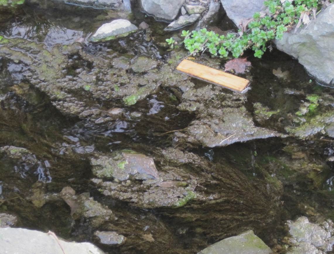 Ein Stück weiter: Handlungsbedarf. Noch fliesst der Bach wie im Hinterhof. – Was ich erst auf dem Foto sehe: im Schatten schwärmten offenbar massenhaft Gewässerinsekten (mal aufs Foto klicken, dann werden sie als Striche sichtbar – längere Belichtung wegen dunkler Verhältnisse).
