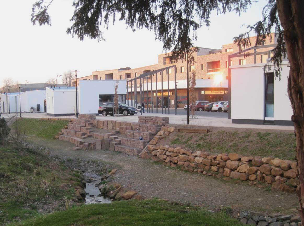 Blick zurück über die Kuhbach auf den Abendsonne angeschienenen Hansa-Platz. Seien wir auf seine Entwicklung gespannt.
