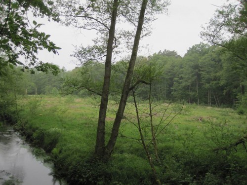 Blick vom Hochufer der Este auf von Nadelholz geräumte Auenfläche. Diese NEL-bezogene Ausgleich- und Ersatzmaßnahme bringt großflächige Verbesserung.