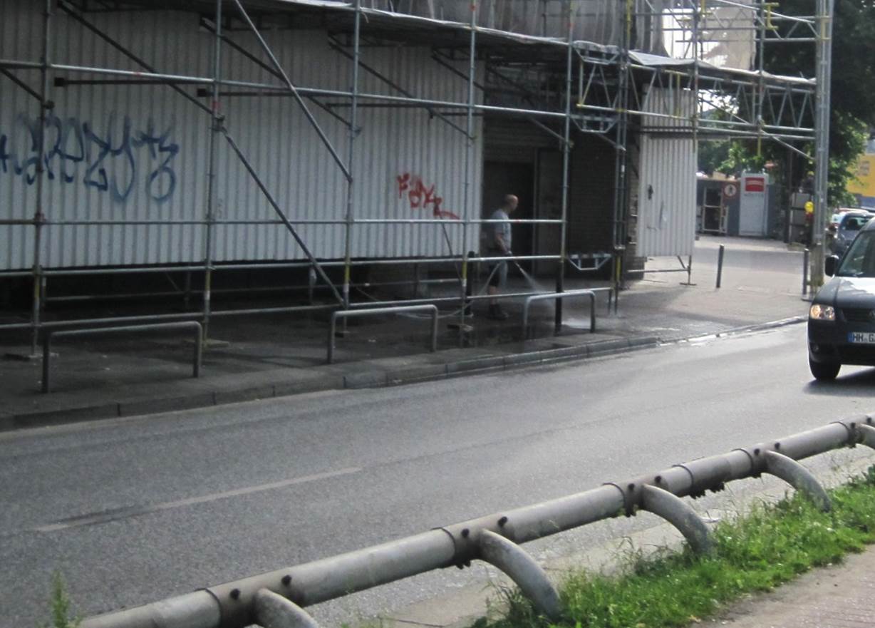 Bei der Umrundung der Hochwasserschutzbaustelle muss ich runter auf die Straße. Was ist DAS denn? Wasser statt Besen – mediterraner Umgang mit dem kostbaren Nass. – Leute, lernt mal dazu!