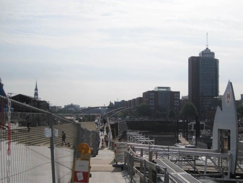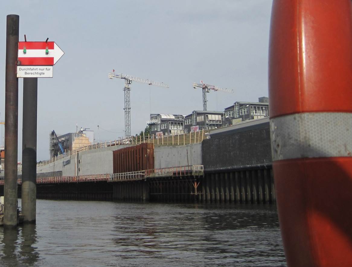 Wieder diesseits der Hochwasserschutzbaustelle, Barkassenanleger erreicht – von fern nahen die anderen, angekommen am U-Bahnhof Baumwall.