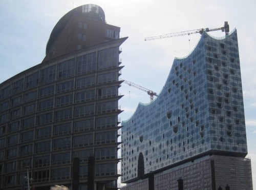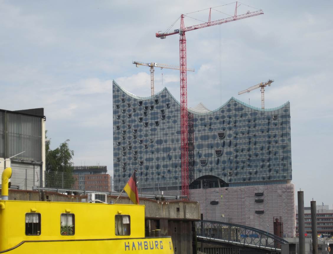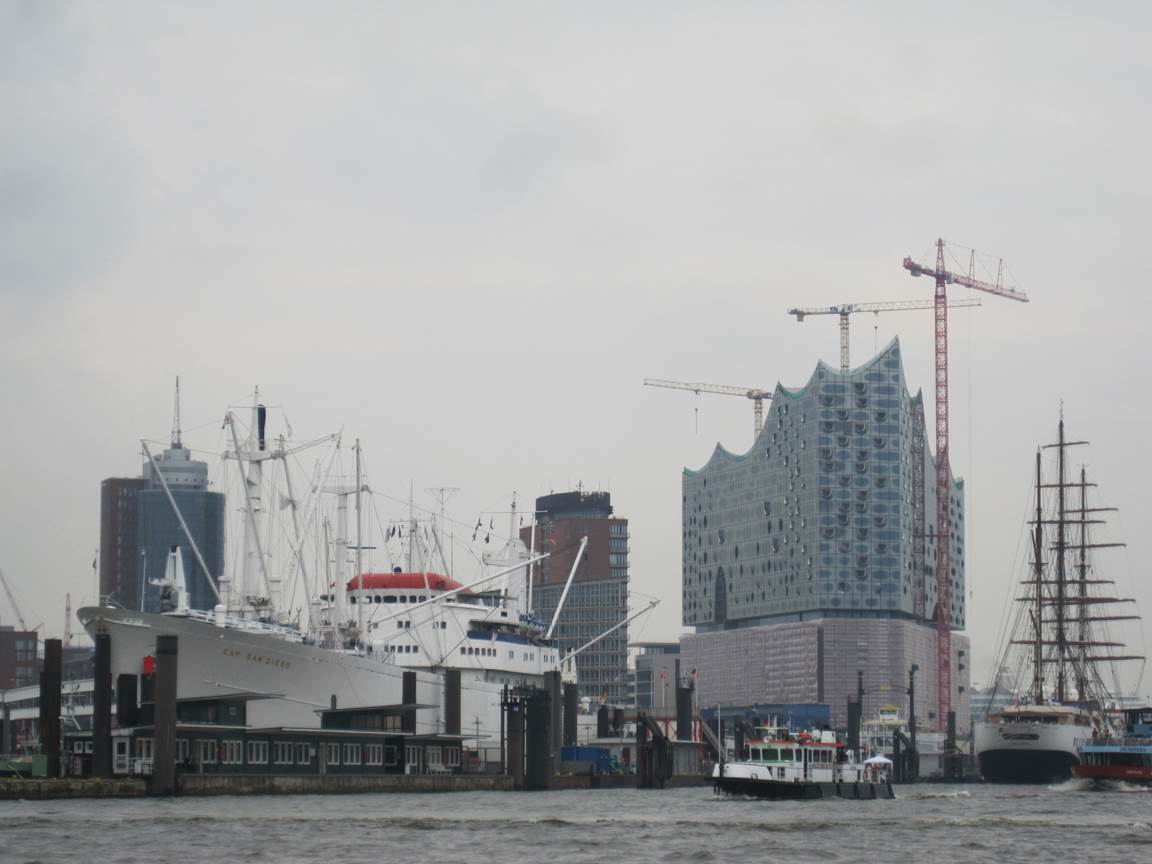 Da hinten irgendwo liegt unsere Barkasse – vor der geldverschlingenden Dauerbaustelle Elb-Philharmonie, hinter den Museumsschiffen Rickmer Rickmers und Cap San Diego.